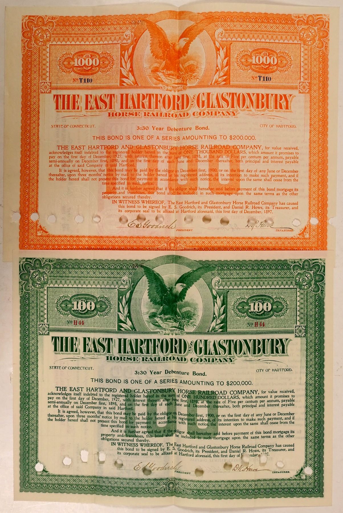 $100 green variety and $1,000 orange variety bonds, 5%, debenture bonds. Issued in 1897, due in 1927. Eagle looking to the right vignette on both. Inc. in Connecticut, City of Hartford. Large holes through the bottom of both certificates to cancel. View photos for detail.
