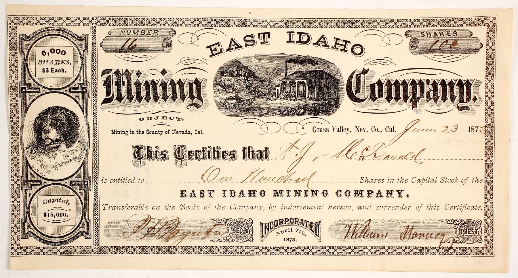 # 16 for 100 shares to AJ McDonald. Signed by William Harvey president and PH Painter secretary. Dateline San Francisco 1873. Incorporated April 7, 1873. Object of the company was to mine in the County of Nevada, Cal. MIlling and St. Bernard vignettes. Not cancelled. One small stain upper center. Excellent. Incorporated to mine the East Idaho Ledge at Grass Valley. Original trustees were Paynter, Harvey, James G James, HC Eggert and William Pollard. Prag Collection State: California City: Grass Valley Date: 1873