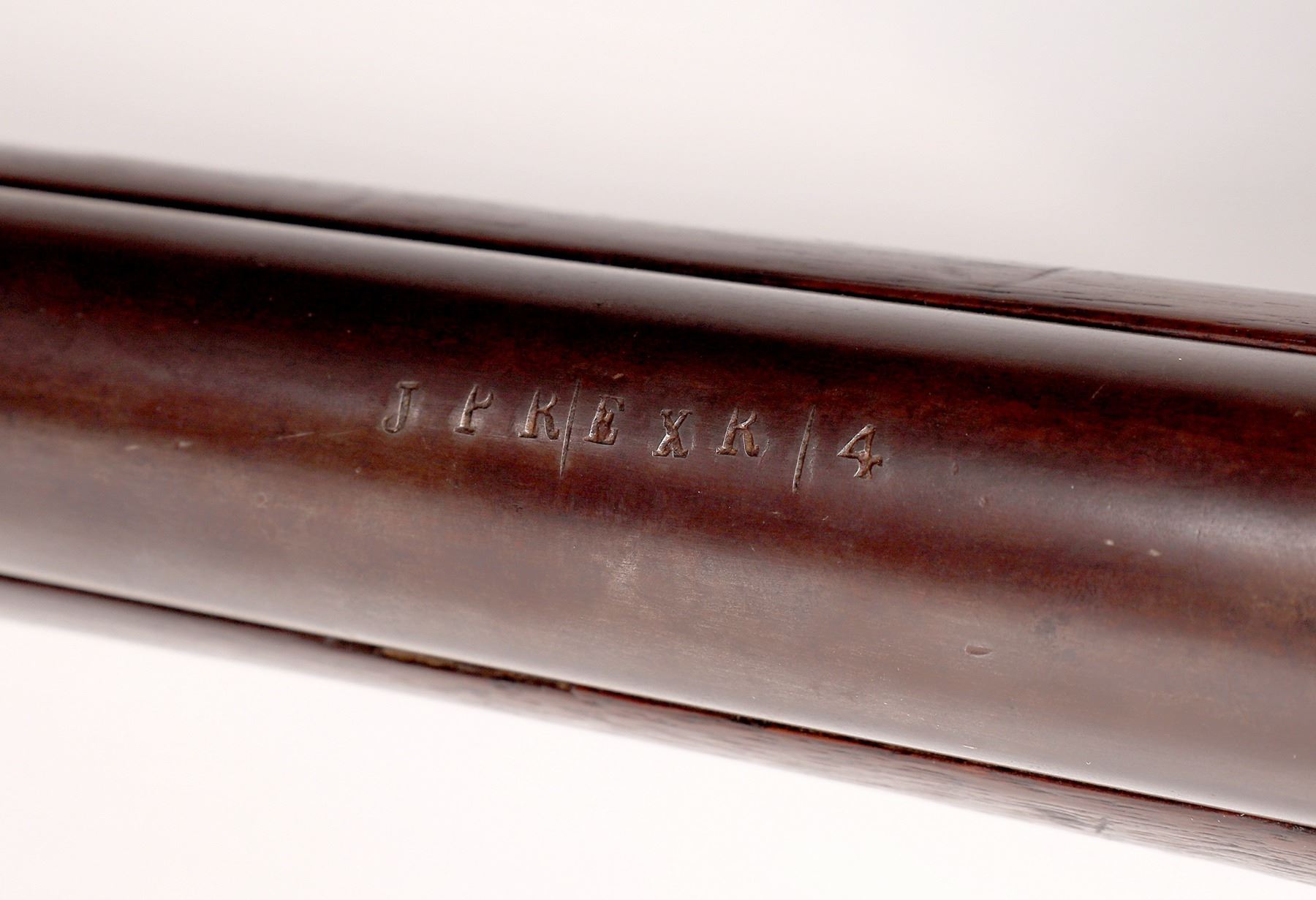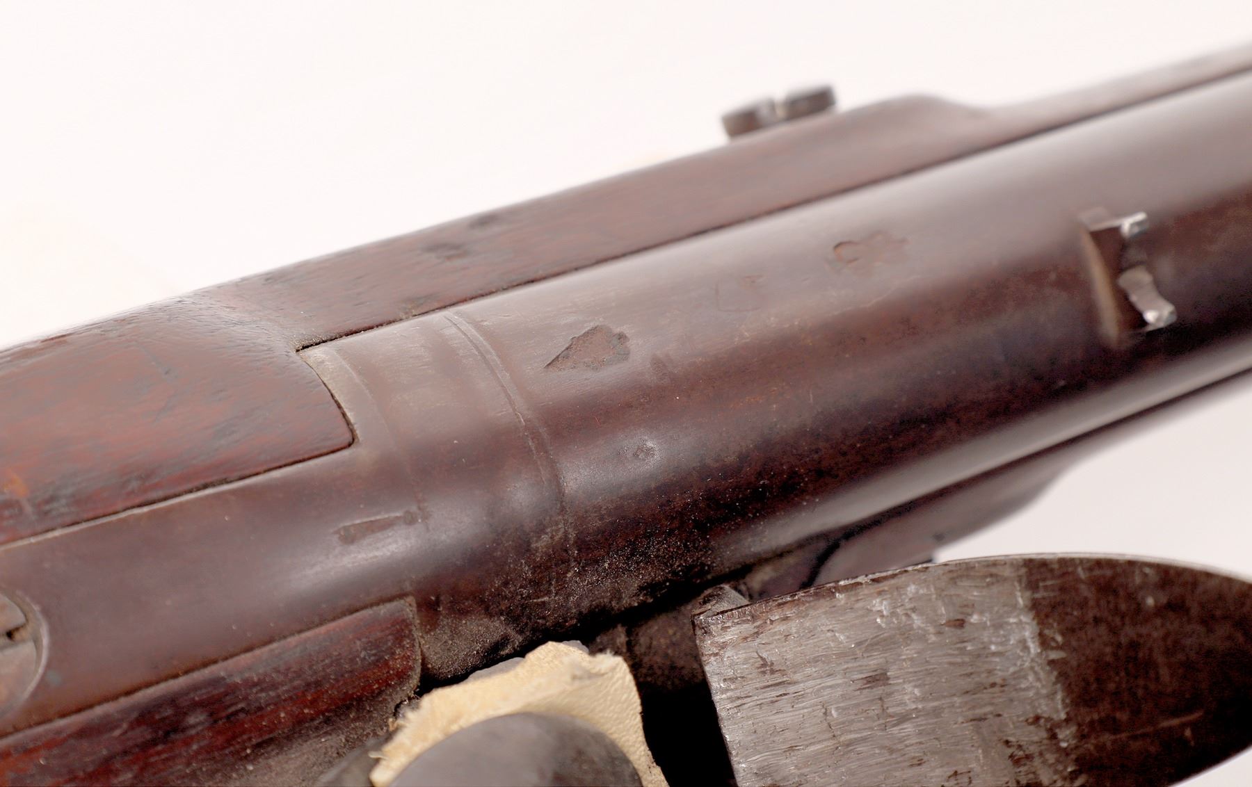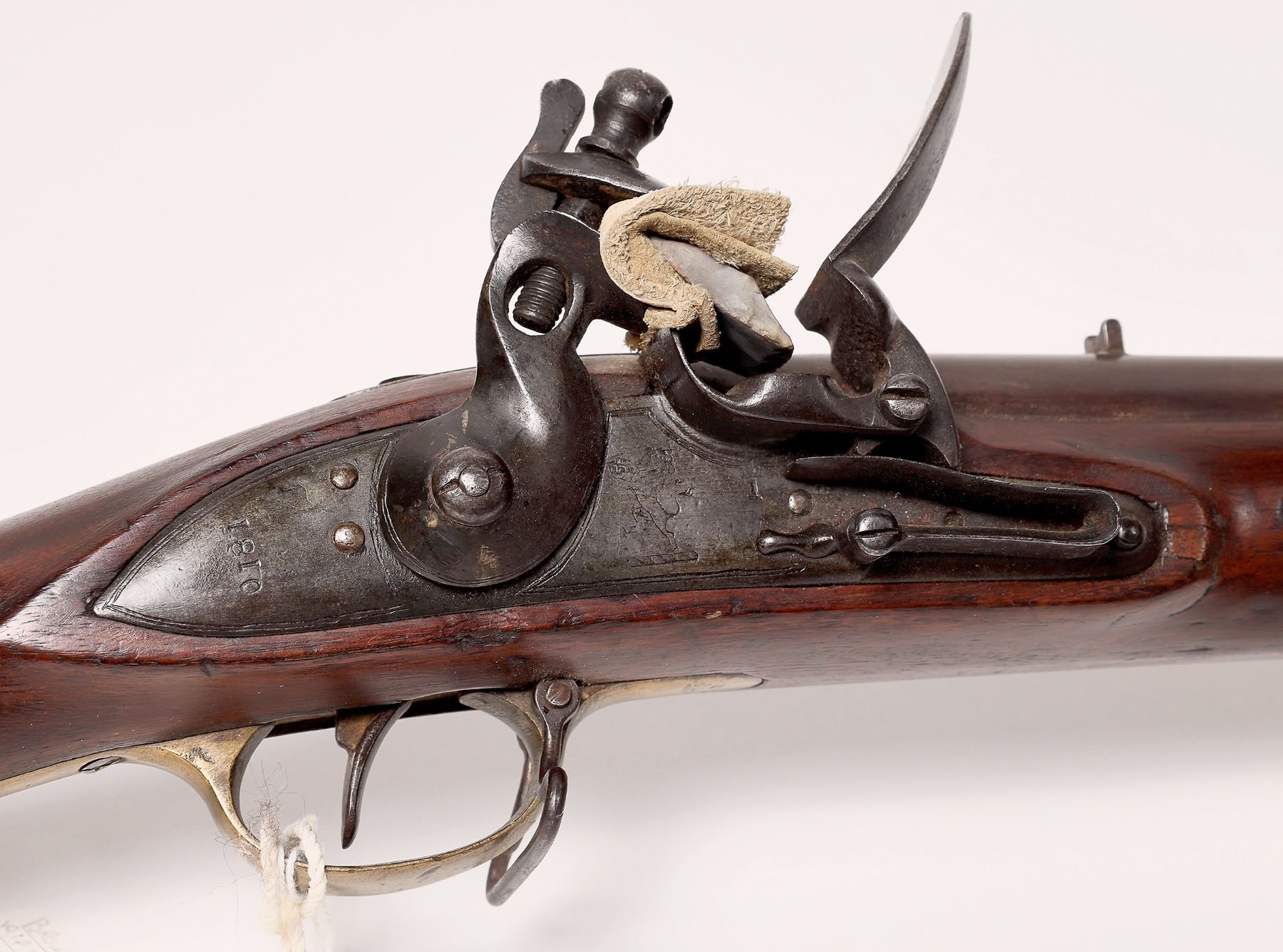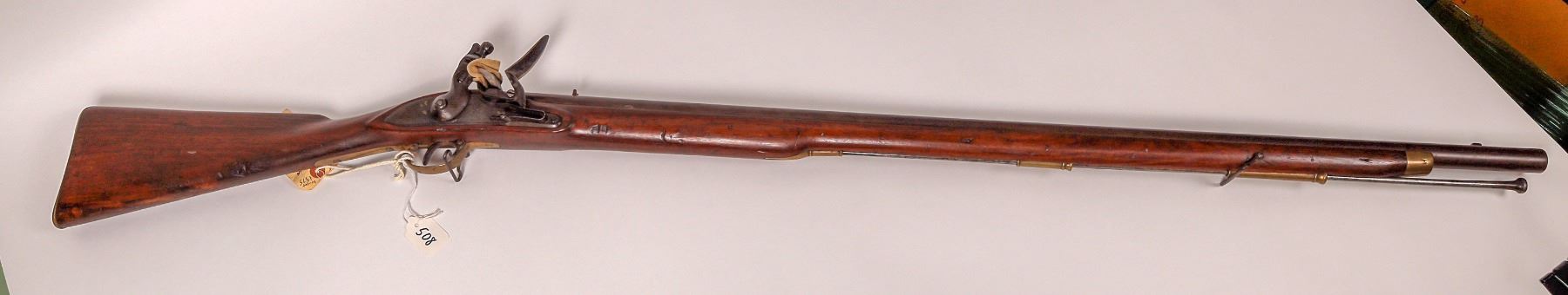 This is a Brown Bess of the East India pattern, dated 1810 on the lock-plate. .80 cal. smoothbore 39 in. barrel 55 in. overall length. There are two British proof marks at the breach as well as the storekeeper's marks "JPR/EXR/4". Another proof mark pattern or regiment pattern is pressed into the buttstock on the right side. There is a rear sight just forward of the lock mortice and a crude lug for bayonet attachment that passes for a front sight. This smoothbore musket has brass furniture for trigger-guard, side plate, ramrod thimbles, and nose cap. The walnut stock is in very good condition with handling marks of 200 years and the barrel has a rich plum patination. The lock works perfectly. This gun is an antique and no attempt has been made to fire this gun to confirm its mechanical integrity. Nor should this gun be fired without the examination by a qualified gunsmith. Any attempt to fire an antique is at the risk of the owner and not consistent with the value of the firearm. No sales to New York City, New Jersey, California, and Hawaii. No FFL required.