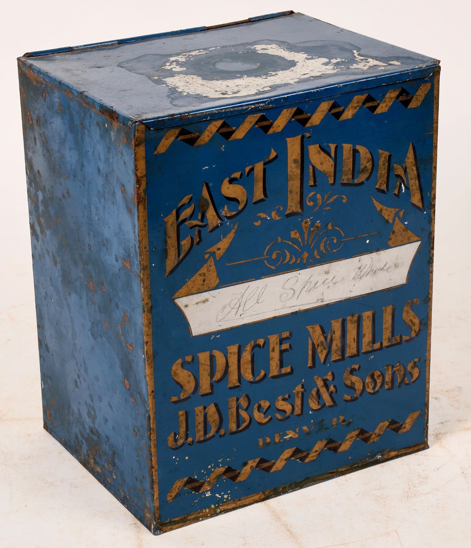 Beautiful metal spice box issued by J.D. Best & Sons of Denver, Colorado. It is lettered East India Spice Mills and measures 8"x 6"x 10" and is labeled "All Spice Whole." The paint is in excellent condition, considering age and use. Please see photos for more details. Denver Colorado Gary Bracken Collection
