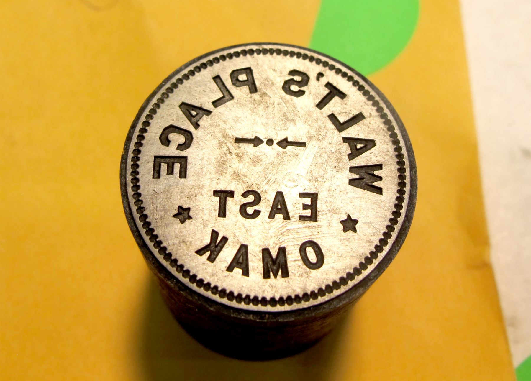 1 token die self identified from Eat Omak, WA. 30mm: Walts Place. Northwest Territorial Mint Historical Token Die Collection