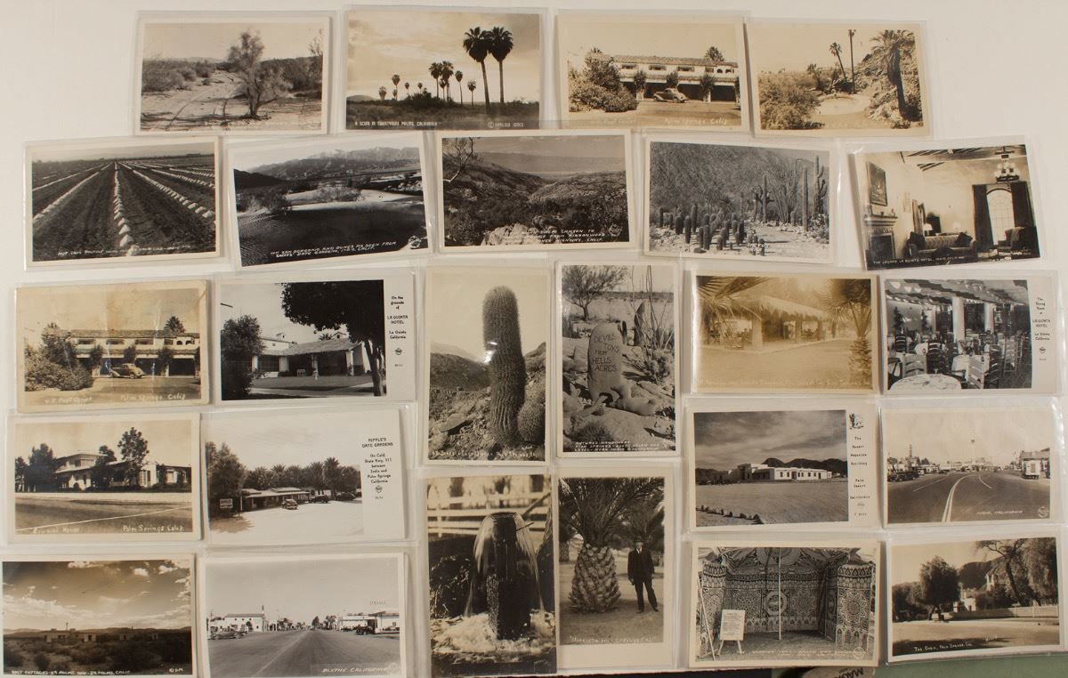 27 RPC's: Mt. San Gorgonio and Dunes as Seen from Sniff's Date Gardens, Indio, Calif.; Barrel Cactus near Palm Springs; Murrieta Hot Springs, Cal.; The Oasis, Palm Springs; Nature's Handiwork, Fish Springs--200 ft. Below Sea Level, near Indio; Smoke Trees and Desert Road, Indio. Other cards: Cactus, Hot Caps, Date Gardens, sand dunes, Smoke trees, Indio, Palm Canyon, Palm Springs, The Oasis, Twenty-nine Palms, Lounge at La Quinta. (Prag collection) City: Palm Desert State: California Date: ID# 23706