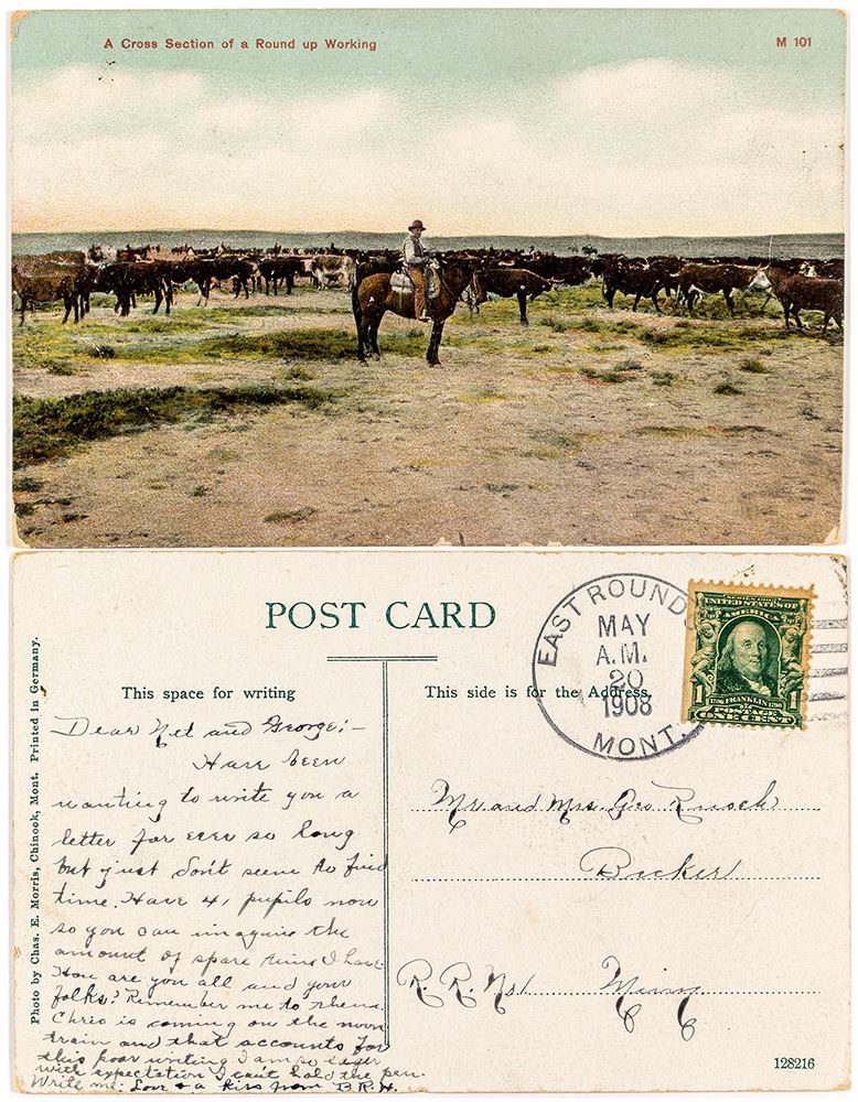 Postcard shows cattle drive. Date: May 20, 1908. (Svoboda Collection) City: East Roundup State: Montana Date: 1908 HWAC# 30948