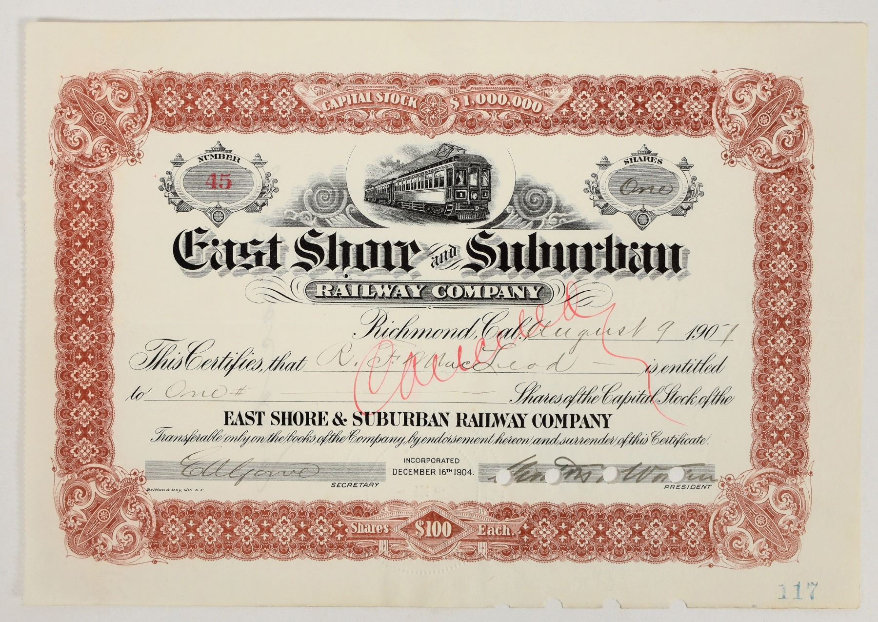 Lot of (1) stock certificate issued by the East Shore and Suburban Railway Company. This was a streetcar service, part of the historic San Francisco Bay Area Key system, operating in Richmond, San Pablo and El Cerrito, with transfers to Oakland. Per historians, this venture also involved the famous Borax Smith. Punch and stamp cancelled, signed on reverse. This variation is from 1907, and in very good condition. Please see photos.
