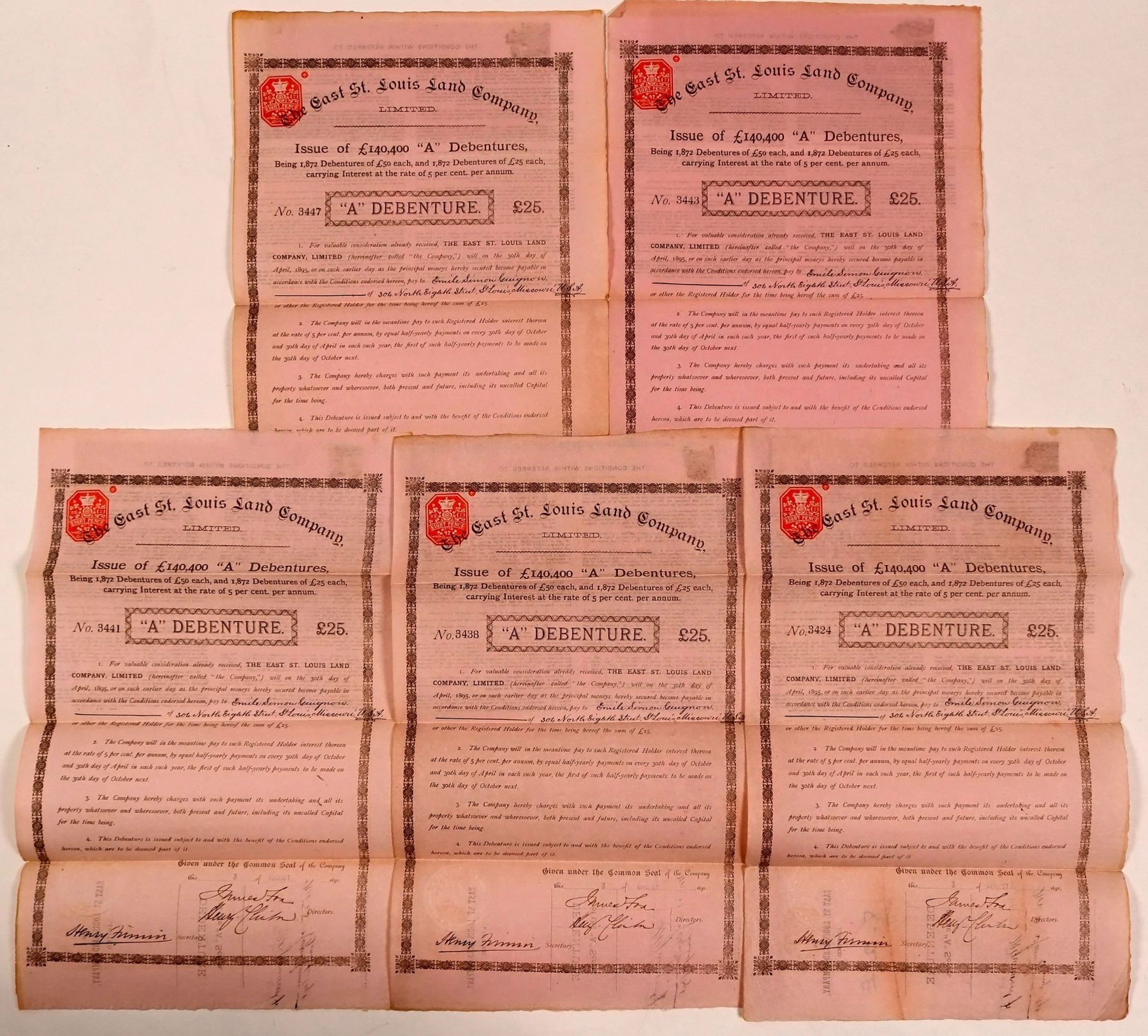 Five bonds issued in 1892 for 25 pounds. Black print on pink paper with foreign revenue imprint. Not cancelled. 17 x 11" Folds, some toning and soiling. Appears to be a British company that was funding development in St. Louis. No other information found.