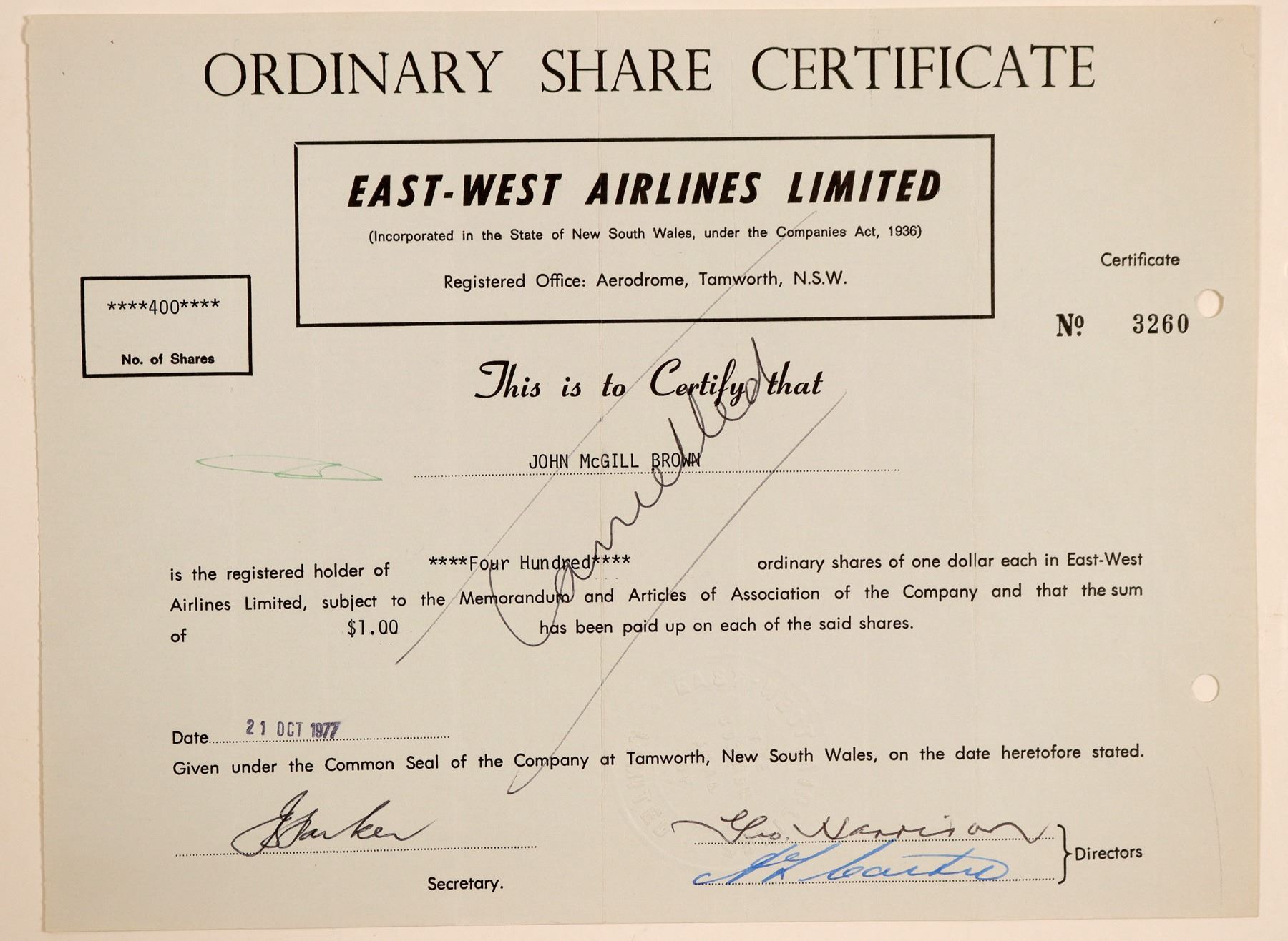 Inc. in the State of New South Wales, under the Companies Act, 1936. No. 3260, issued for 400 shares to John McGill Brown on Oct. 21st, 1977. Signed by two directors and a secretary. Pen and punch cancelled. 7.5 x 10" Folds. East-West Airlines was an Australian regional airline founded in Tamworth, New South Wales in 1947. By the 1980s, it was Australia's third largest domestic airline. Ceased operations in 1993. Ken Prag Collection