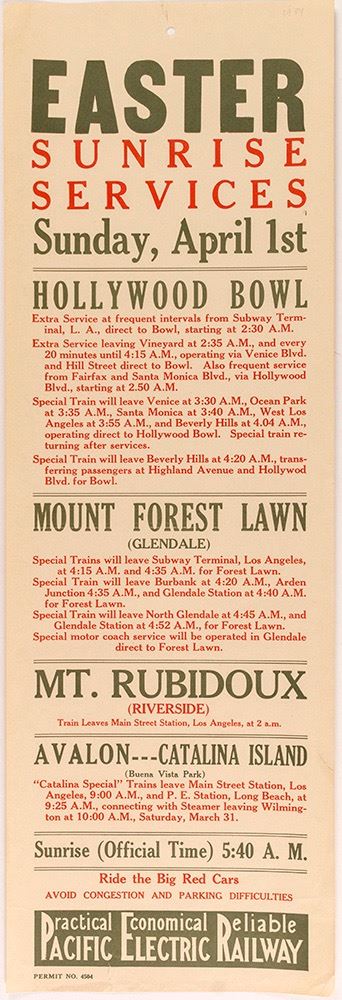 Hollywood Bowl, Mount Forest Lawn, Mt. Rubidoux, Avalon stops for Easter services. Sunday April 1 year unknown. Pacific Electric Railway. 6" x 18". Date: Location: Los Angeles, California HWAC # 54103