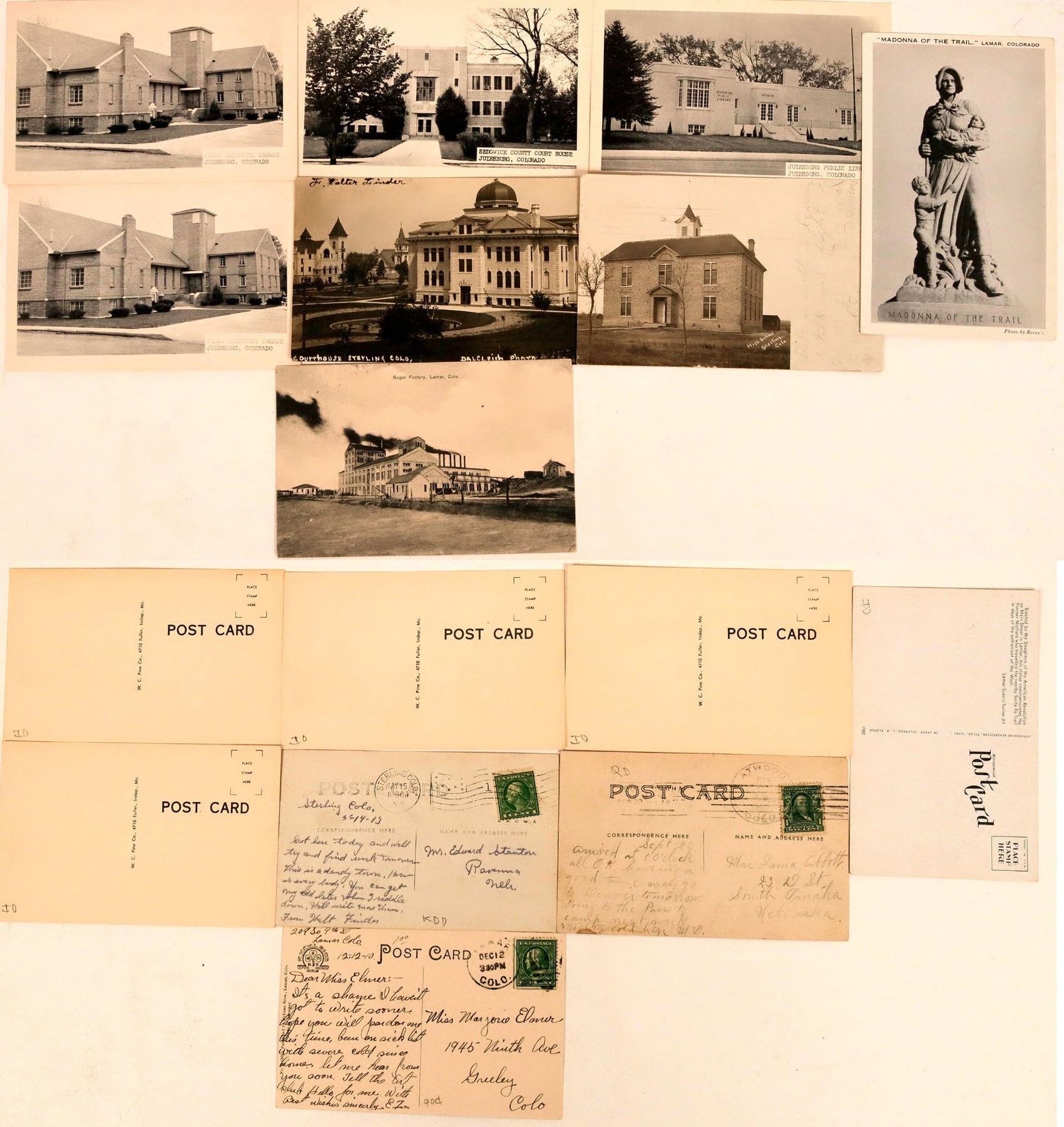Includes four RPCs from Julesburg and two postcards each from Lamar and Sterling. The Sugar Factory in Lamar is featured, along with the courthouse and high school in Sterling. The Methodist Church (2) along with the courthouse and public library are the cards from Julesburg.