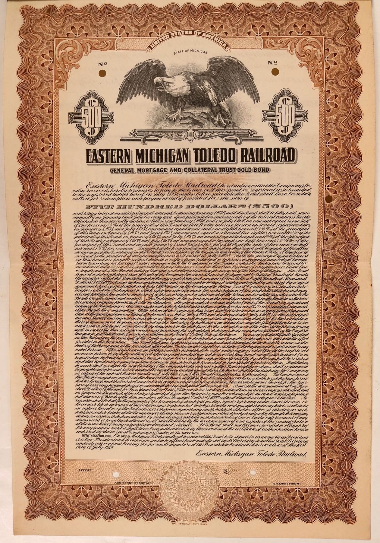 No examples of any certificate, stock or bond from this railroad in Cox. This is a Specimen bond certificate, $500, General Mortgage and Collateral Trust Gold Bond, due 1958. Vignette of a large eagle with wings outstretched. Inc. in Michigan. Black on creme with brown borders. Small hole punches at the bottom spell out, "Specimen" "Hamilton Bank Note". The bond would have been issued in 1928. Fifty-eight coupons attached at the front. VF. Extremely rare.