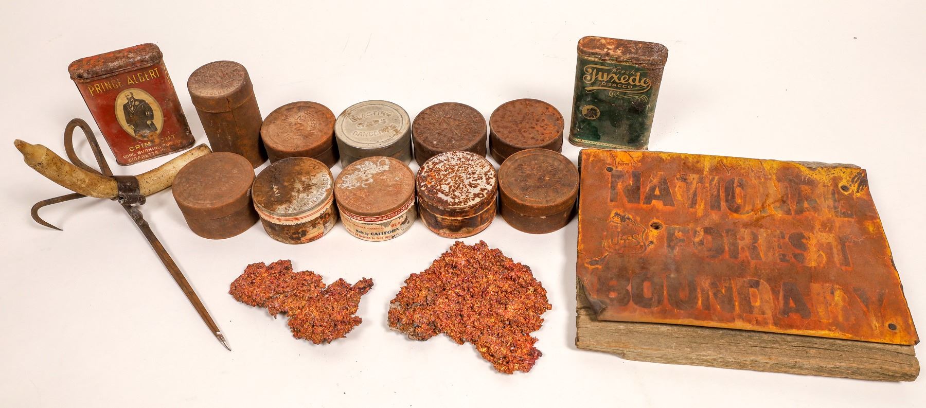 A collection of Western and mining memorabilia to get you started on a collection or to round out the one you already have. The highlight of the lot is the pair of copper splash pieces, 136 grams and 293 grams, from the Kennecott Copper Smelter in McGill, Nevada, which was first fired up in 1908 and then acquired by Kennecott in 1932. It processed copper ores from the nearby Ruth open-pit copper mines and elsewhere until the smelter was closed and demolished after the 1983 decline in ore grades and the drop in copper prices. Then you have an underground miner's candlestick about 12.5 inches long. Next in the lot are nine empty blasting cap cans, two Prince Albert tobacco cans, and a Royal brand baking powder can. Finally, a 9.5 x 7-inch National Forest Boundary sign pierced by a bullet and still attached to the wood backing that was split by that same bullet. See photo for the details.
