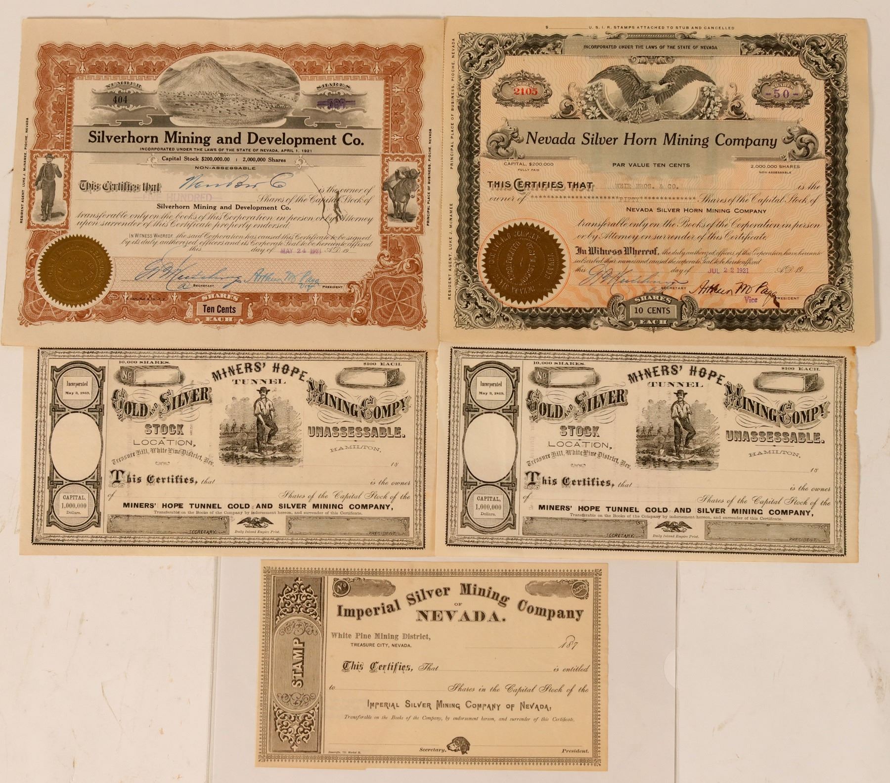 Lot of five certificates: Miners' Hope (Treasure Hill, White Pine District)(2), Nevada Silver Horn Mining Company (Pioche), Silverhorn Mining and Development Co. (Pioche), Imperial Silver Mining (Treasure City, White Pine District.) Three unissued, two issued.