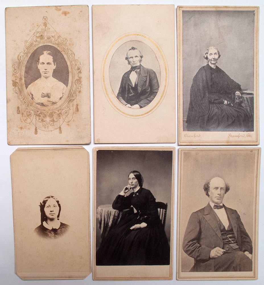 Set of six. Two Crawford of Stamford, CT. Whitney & Beckwith of Norwalk, CT. Kimball of Manchester, NH. Chamberlin of Norwich, NY. One unknown. Photographs of men and women.