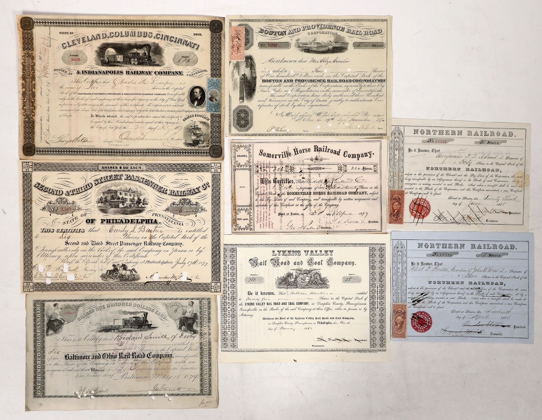 Issued-1864 and 1868 Northern RR, 1862 Lykens Valley RR and Coal, 1872 and 1877 Second & Third Street Passenger RW, 1870 Boston and Providence RR, 1877 Somerville Horse RR, 1879 B & O RR.
