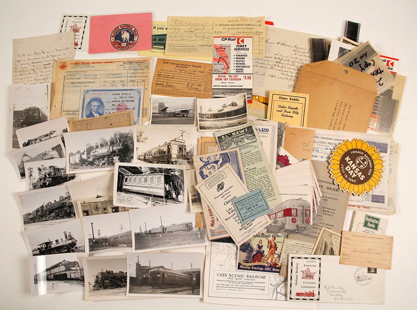 Group includes 3 1960's British railway related covers, numerous small b/w glossy photos of locomotives and cars, assortment of 35mm b/w negatives of trams, trolleys, houses etc, b/w photo of Panama Canal lock 1926, numerous railroad employee pamphlets, several Phoebe Snow Lackawanna streamliner envelopes, 1898 Penna RR timetable, colorful Amalgamated Assoc. of Street, Electric Railway and Motor Coach Employes(sic) of America certificate of membership 1939, several Great Plains Railway Co. stock related items, 1905? trust deed Topeka Railway Co., colorful ABC network Railroad Hour Show Train card, Santa Fe Trailways bus postcard, 1924 Santa Fe Masonic membership card, numerous Illinois Central Railroad Co. billheads 1953 and much more. Date: Location: HWAC# 56149