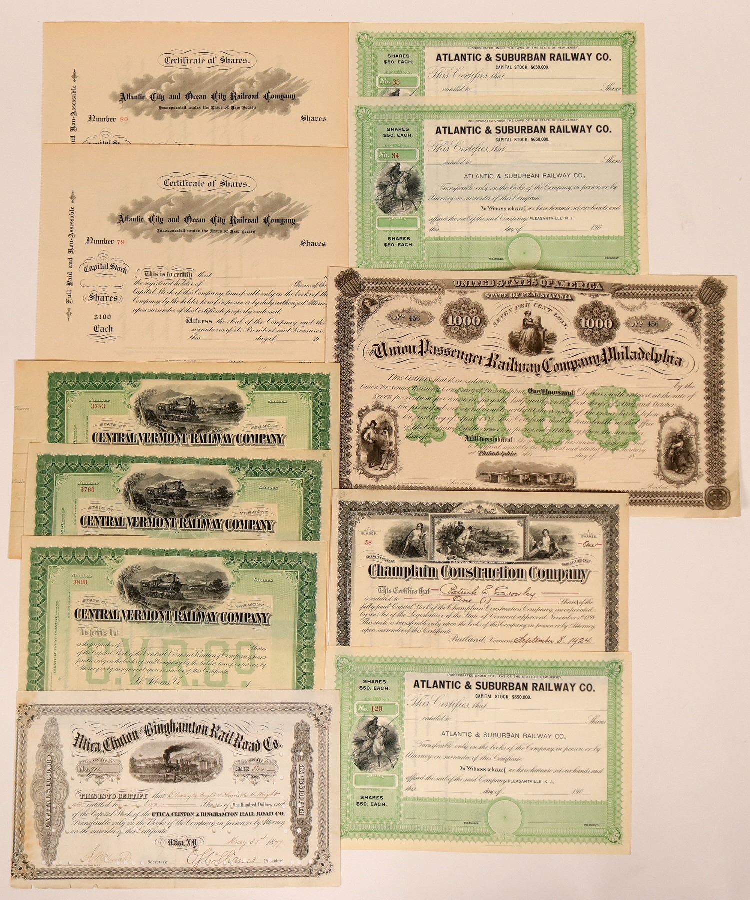 This lot contains six unused stock certs, including Central Vermont RR, Union Passenger Ry Company, Atlantic& Suburban RY and others.Cancelled stock certs are issued by Champlain Const. Co and the Utica, Clinton & Binghamton RR Co. All are in good condition.