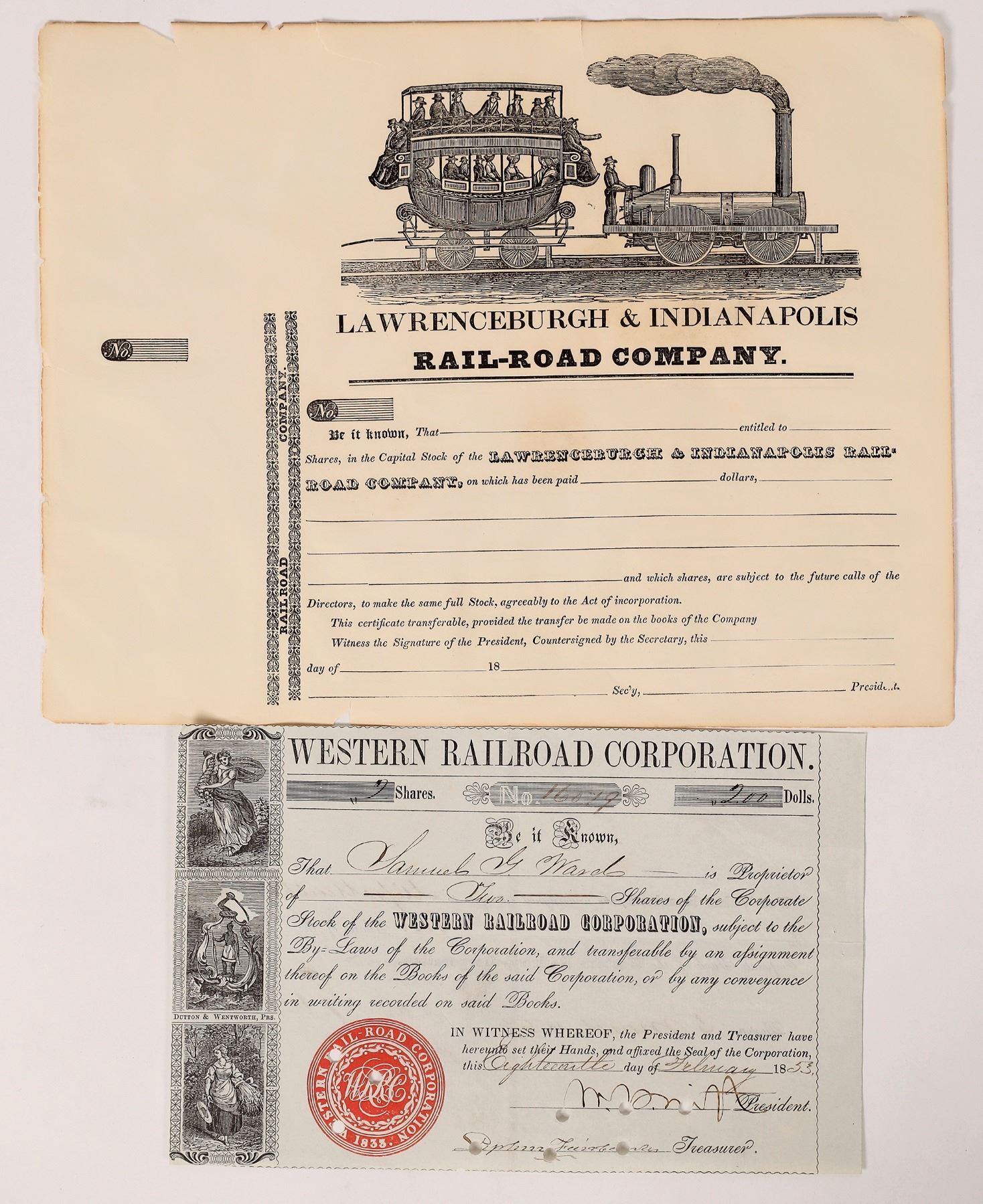 Unissued Lawrenceburg & Indianapolis Rail Road stock, c. 1830's. Nice vignette of an old fashioned steam locomotive pulling a full stagecoach with train wheels. Issued 1853 Western Railroad Corporation, 2 ladies and 1 man? vignettes. Franklin Collection