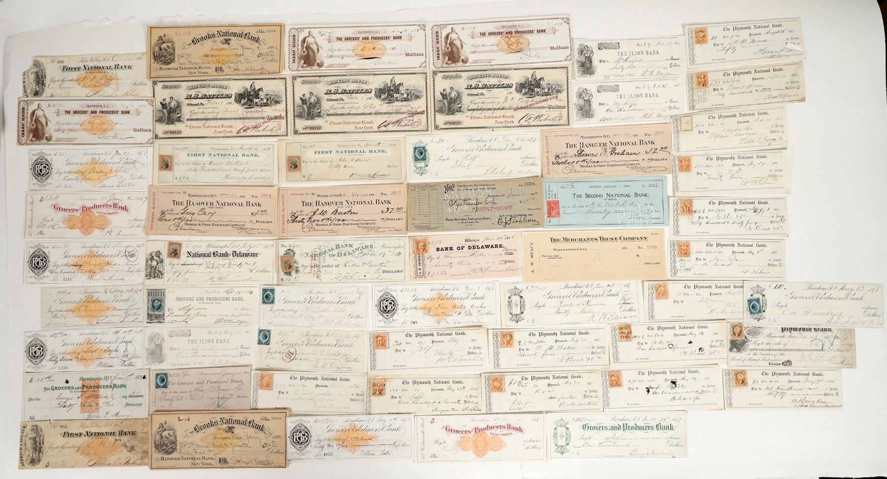 Lot of 55. Rhode Island, Connecticut, Massachusetts, Virginia, Deleware, Pennsylvania, New York. Includes 15 RNs, mostly Rhode Island. Earliest checks are 1850s New York. Most are 1870s-90s. Please inspect.