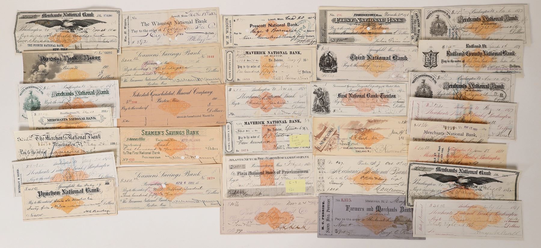 Assortment of Eastern RN checks, c. 1869-1902. New Jersey, 2 RNG, 1 RNC, 1 RNX. Vermont 3 RND, 3 RNX, 1 RNC, 8 RNG. Massachusetts 3 RNG, 6 RNX, 1 RNB, 2 RNE. c1869-1902