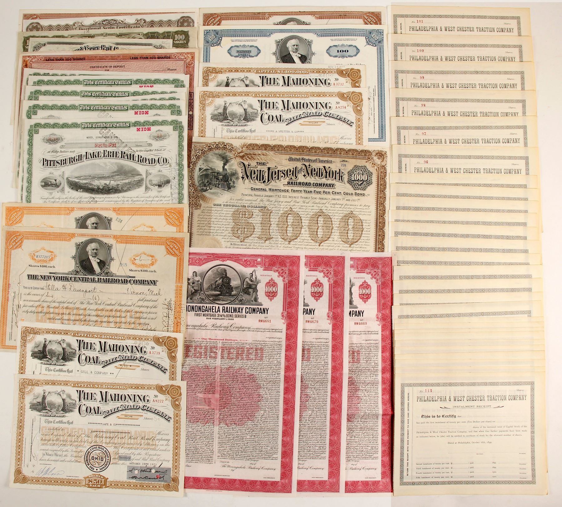 Approx 47 railroad stocks and bonds from Eastern states, some issued some not. Monongahlea Railway, NY Central Railroad, NJ and NY Railroad, Market Street Railway, Morris and Essex Railroad, Pittsburgh and Lake Erie Railroad, Philadelphia and West Chester Traction, Mahoning Coal Railroad City: State: Eastern Multi-State Rails Date: