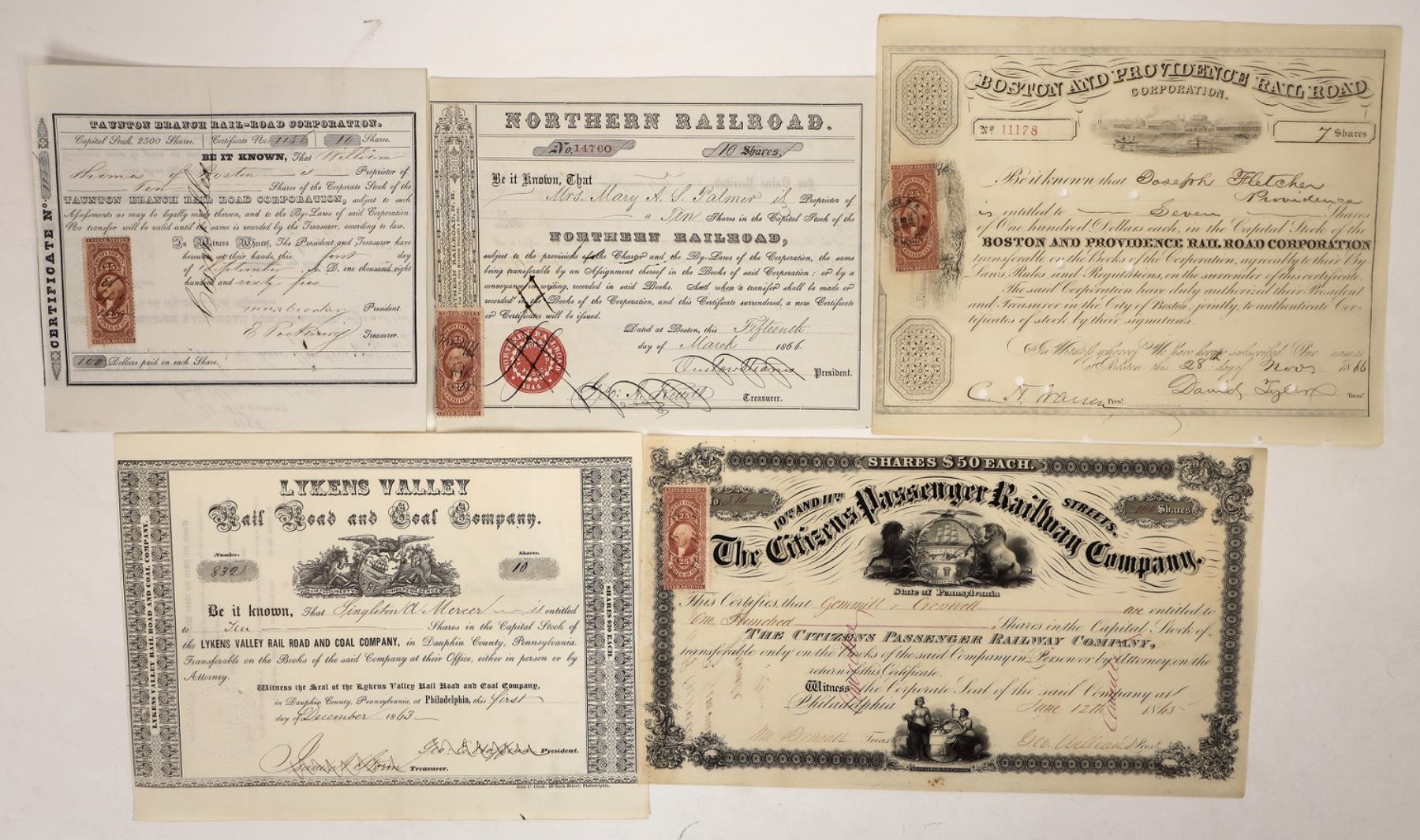 Group of 5 stock certificates from various eastern U.S. railroad companies, one dated 1863 and four dating 1865-1866. The 1865 stocks were both issued a few months after the end of the war. All certificates are issued, 4 of 5 are cancelled. Some minor foxing and edge wear on a few certs, but all are generally in excellent condition for their age. 25¢ IR stamps on several.