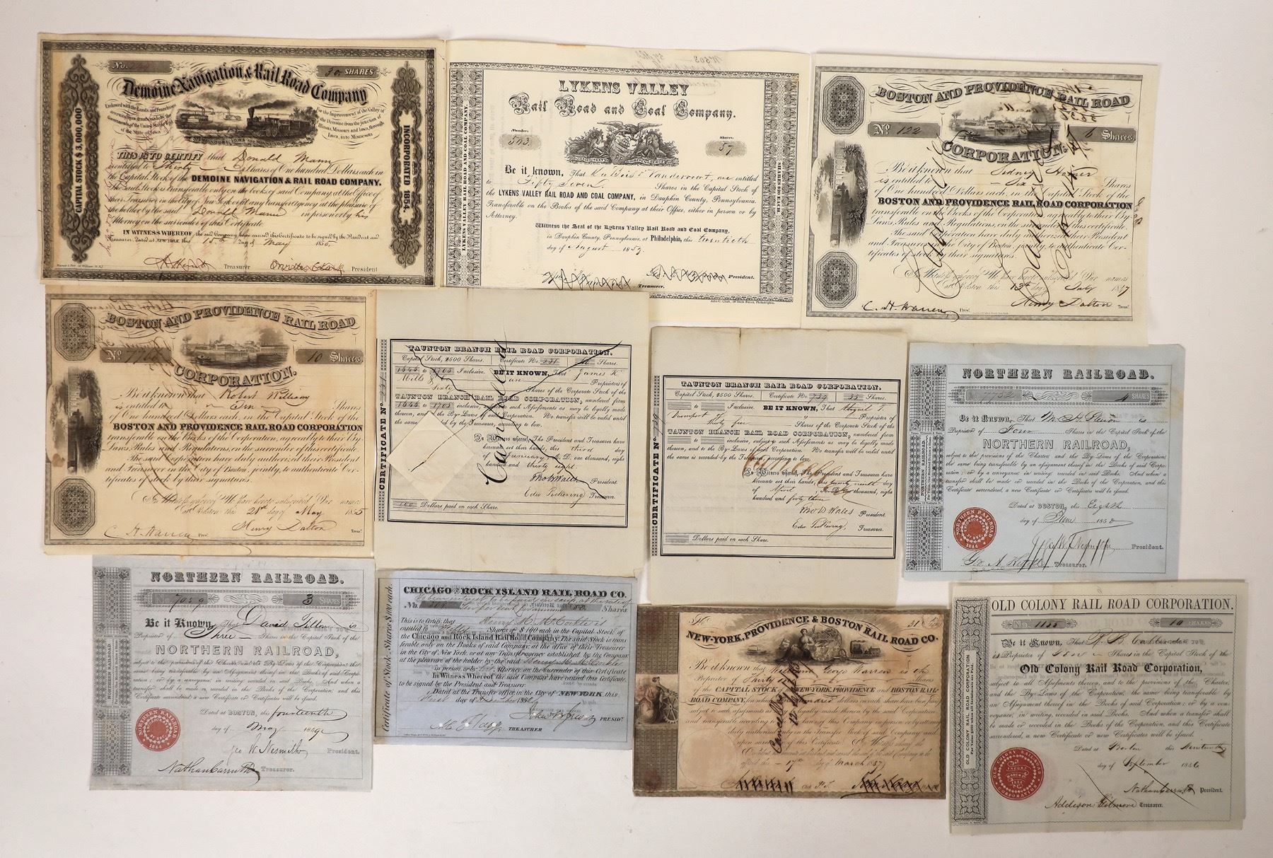 Group of 12 stock certificates from various eastern U.S. railroad companies, dating 1837 to 1857. All certificates are issued; 10 of 12 are cancelled. All are signed by president and treasurer. The certs are in varying condition, with some foxing and toning on a few. The lot is generally in great condition for its age.