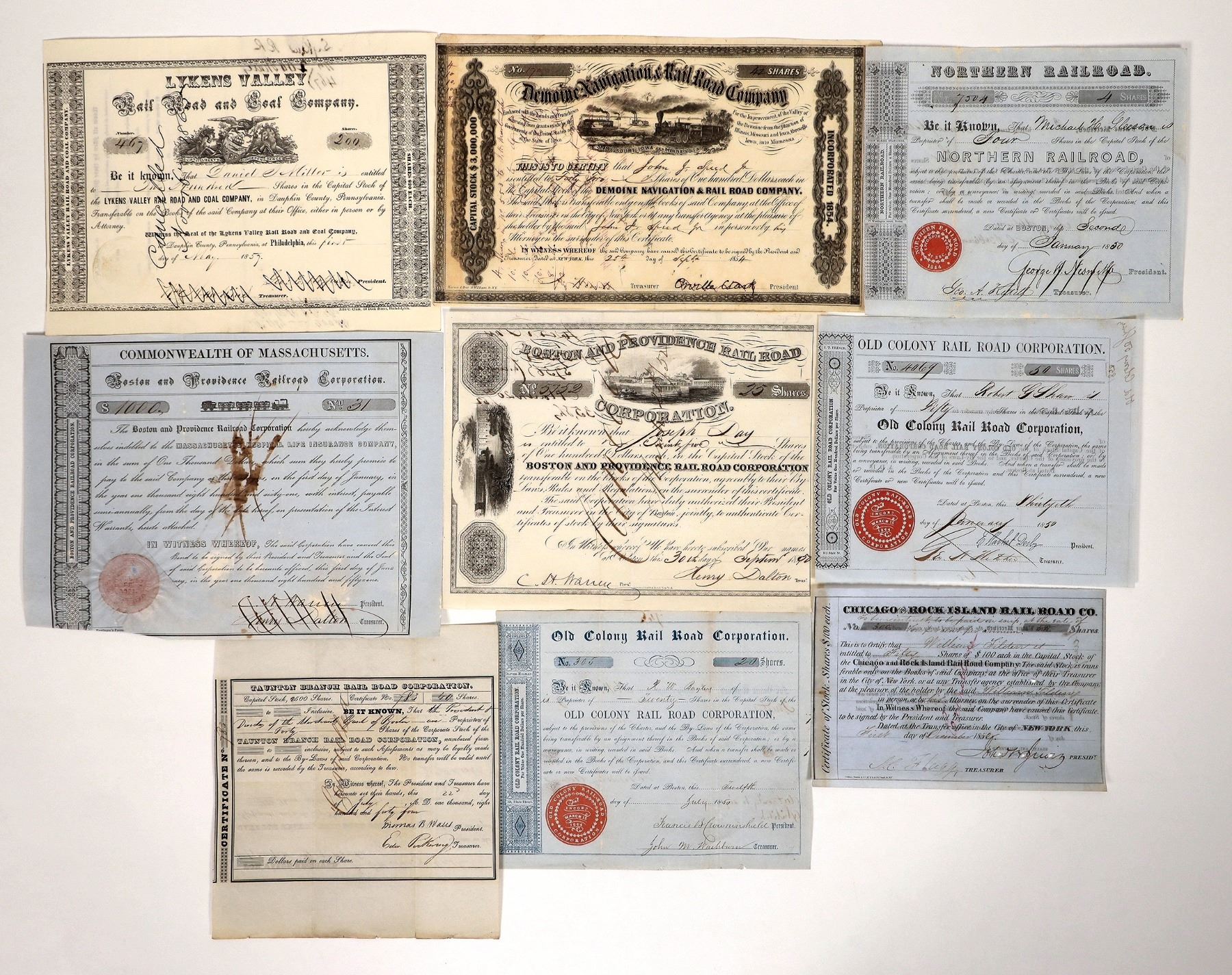 Group of 9 different stock certificates from eastern U.S. railroad companies, dated 1844-1857. All certificates are issued, 5 of 9 are cancelled. Two nice railroad/infrastructure vignettes. Some edge wear and light toning/foxing on a few certs, lot is otherwise in great condition for its age.