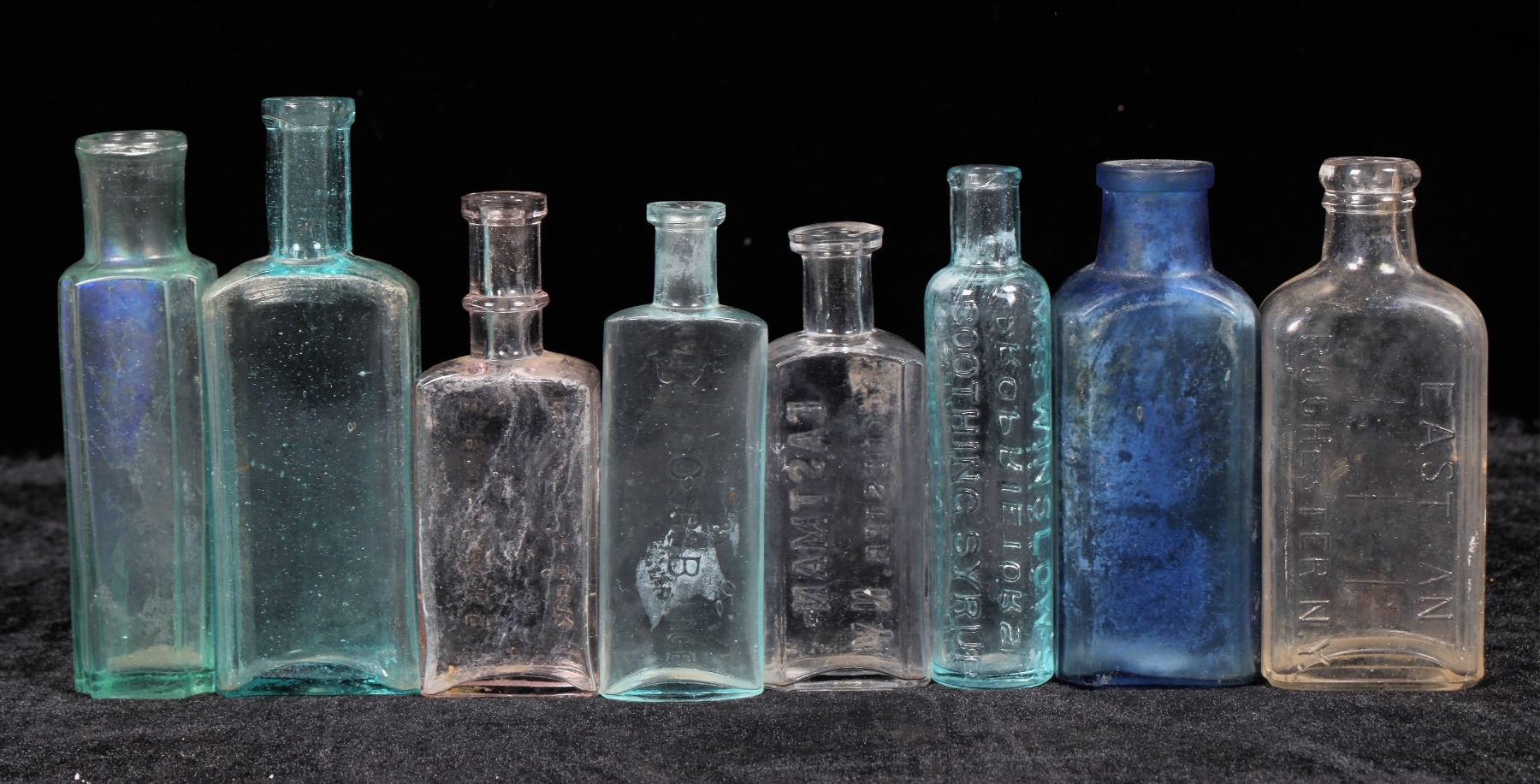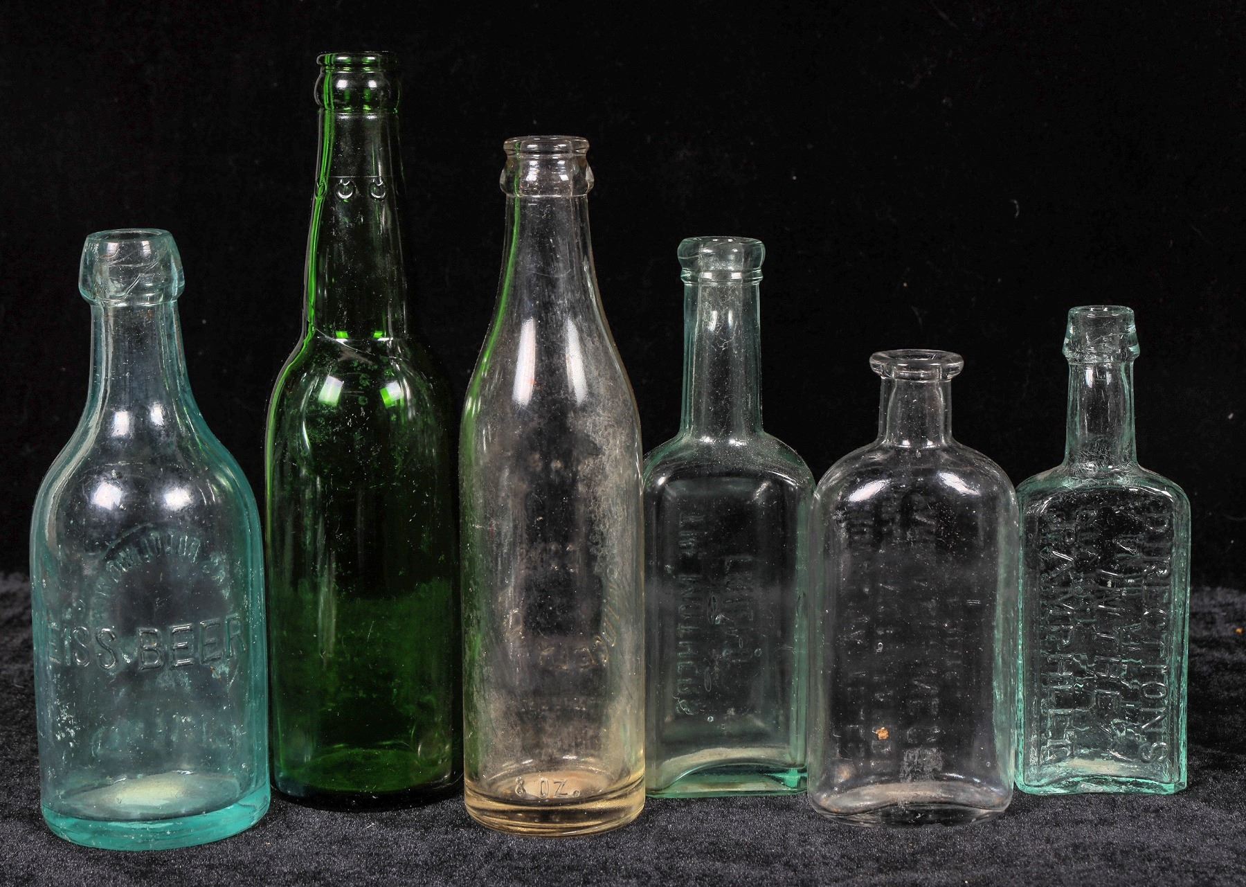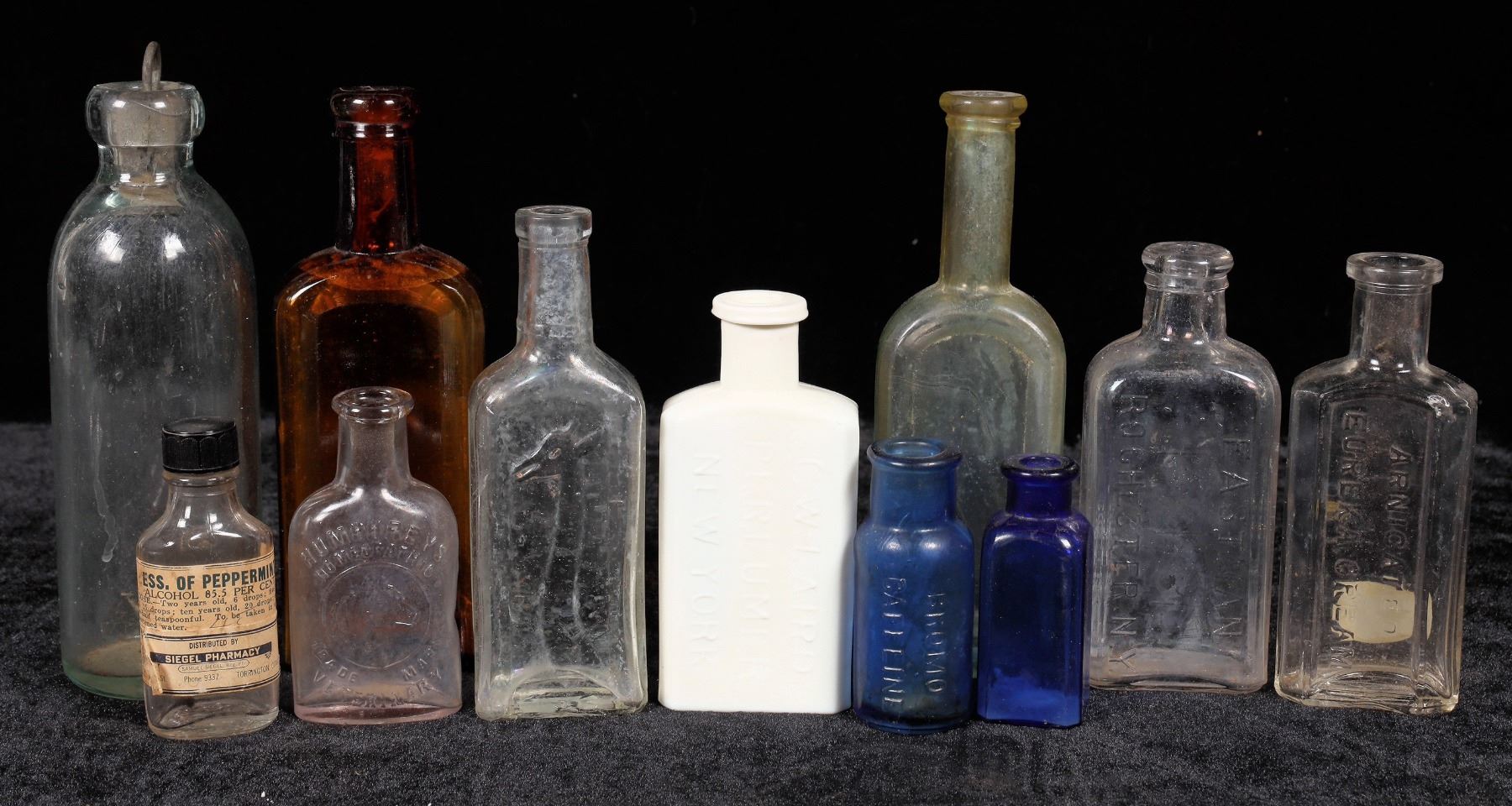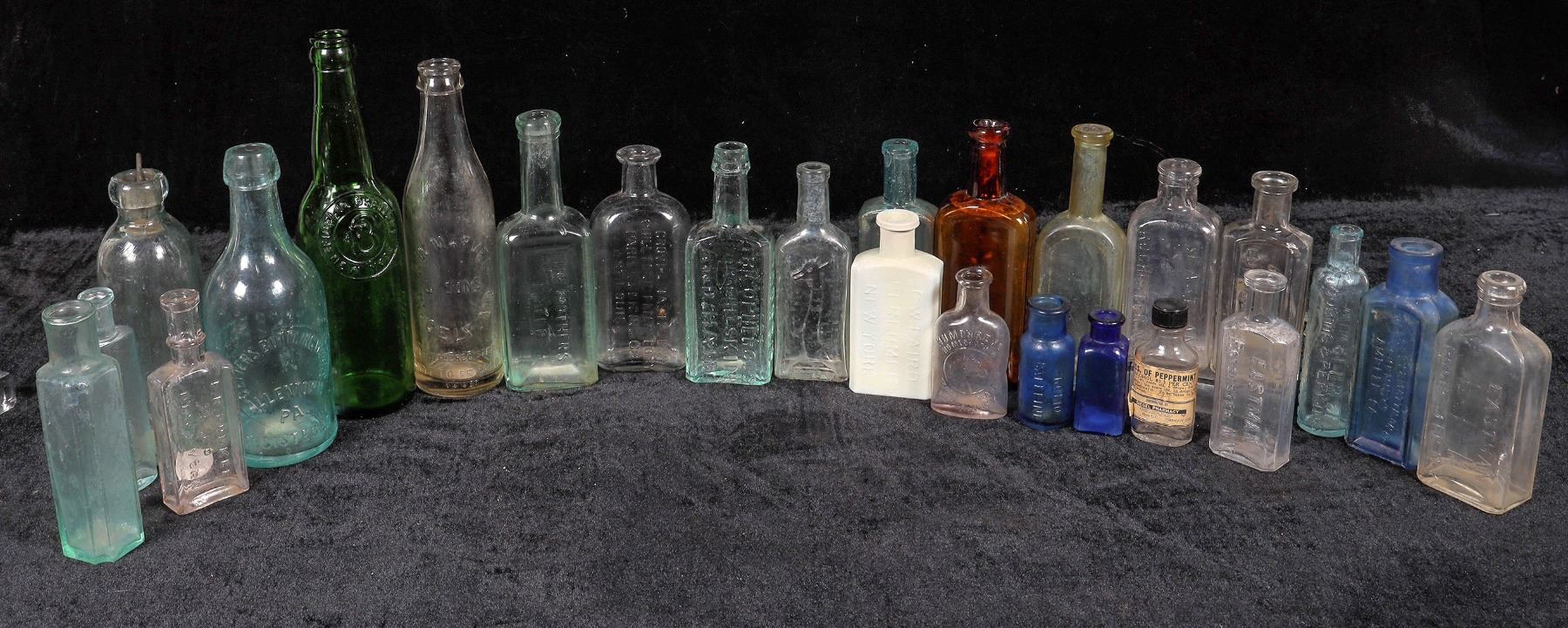 24 Eastern US bottles, 4.75-9.5". Syrup, beer, very rare Bromo and caffeine, giraffe, mil glass perfume etc. Cobalt, amber and clear. See photo.