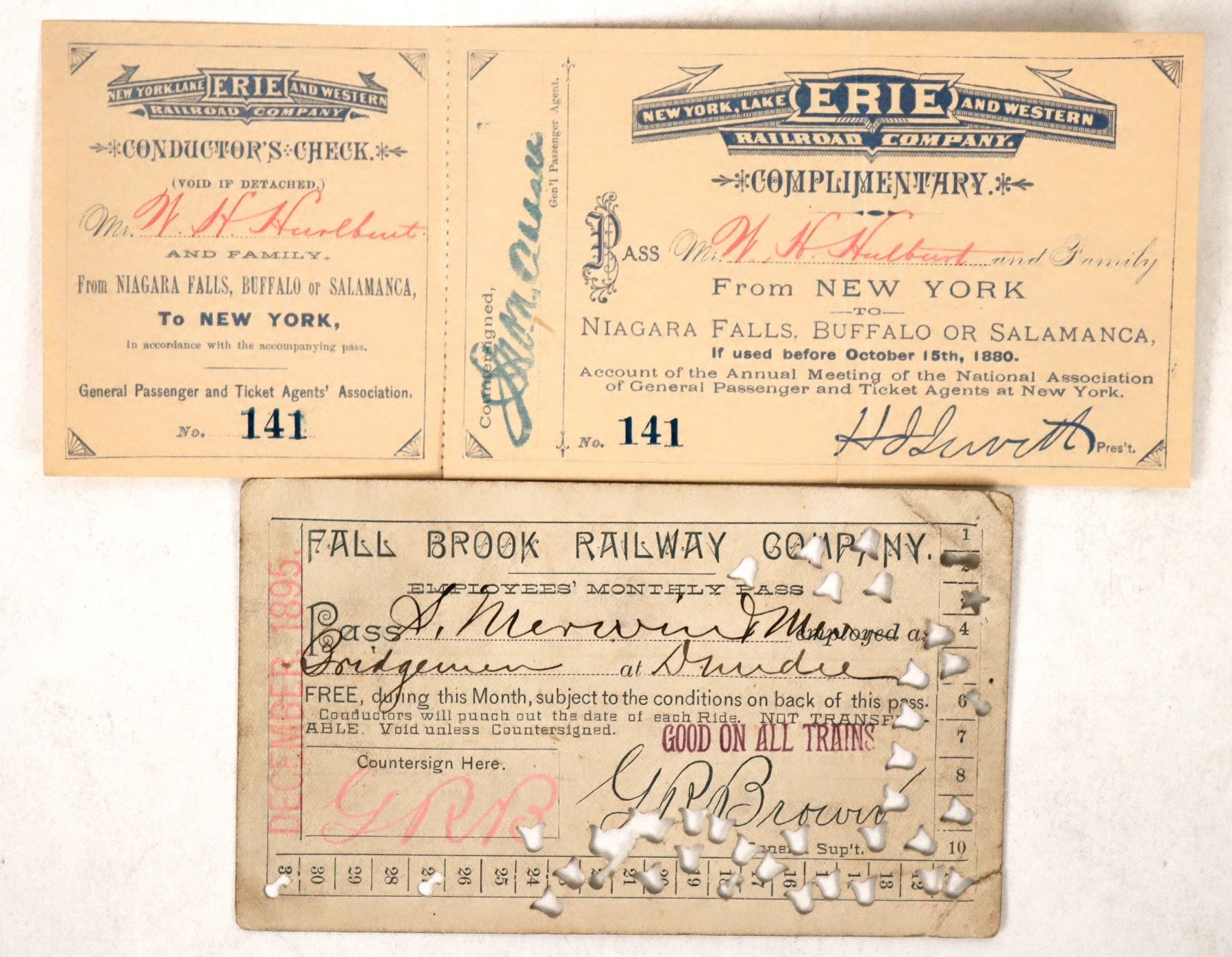 1895 Fall Brook RW with lots of punches, 1880 New York Lake Erie and Western RR with mostly attached conductor's check.