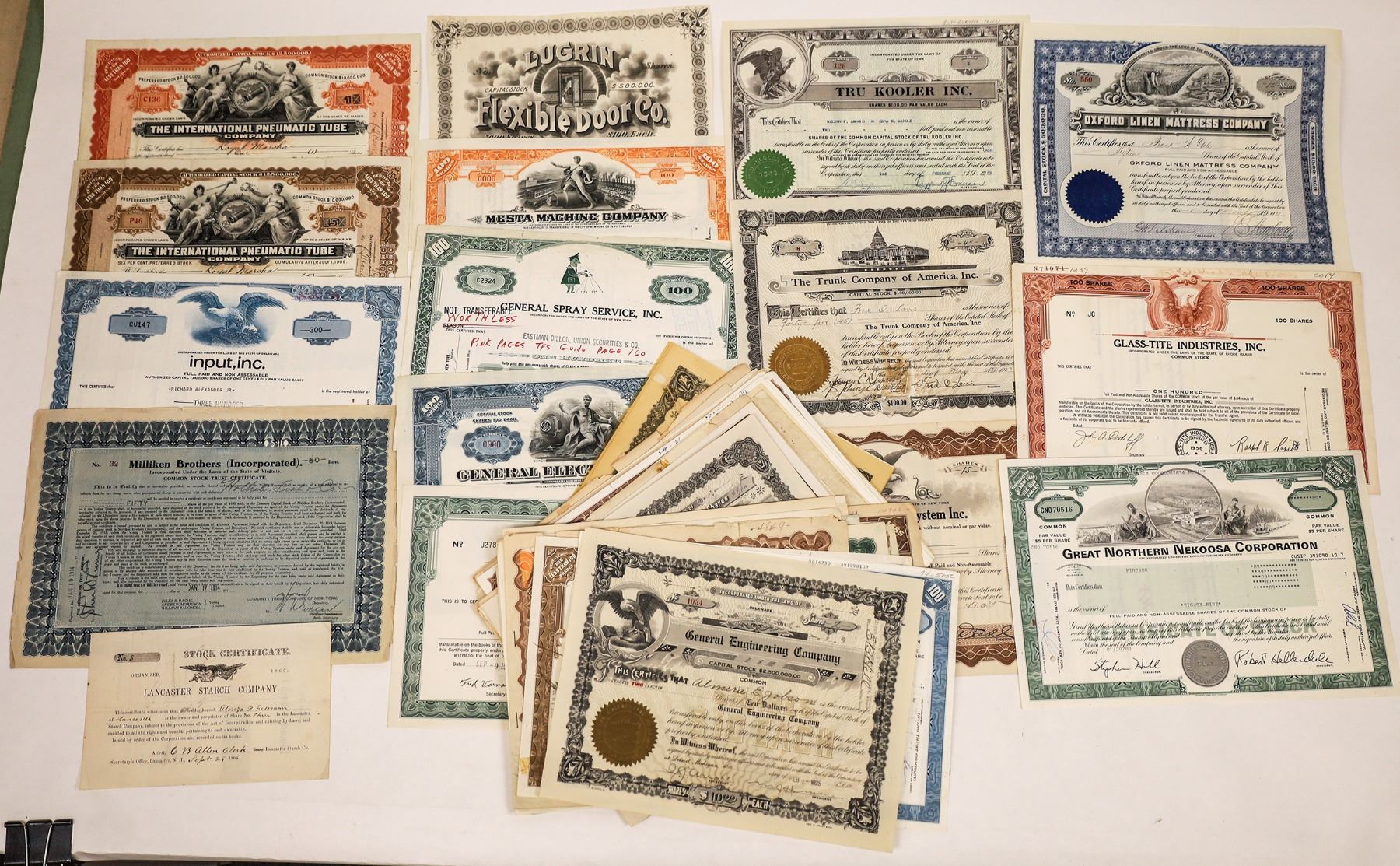 67 stocks from a wide variety of manufacturing companies. Includes Lancaster Starch 1866; International Pneumatic Tube, 1910; Lugren Flexible Door 1890s. About half do not have vignettes. See photo.