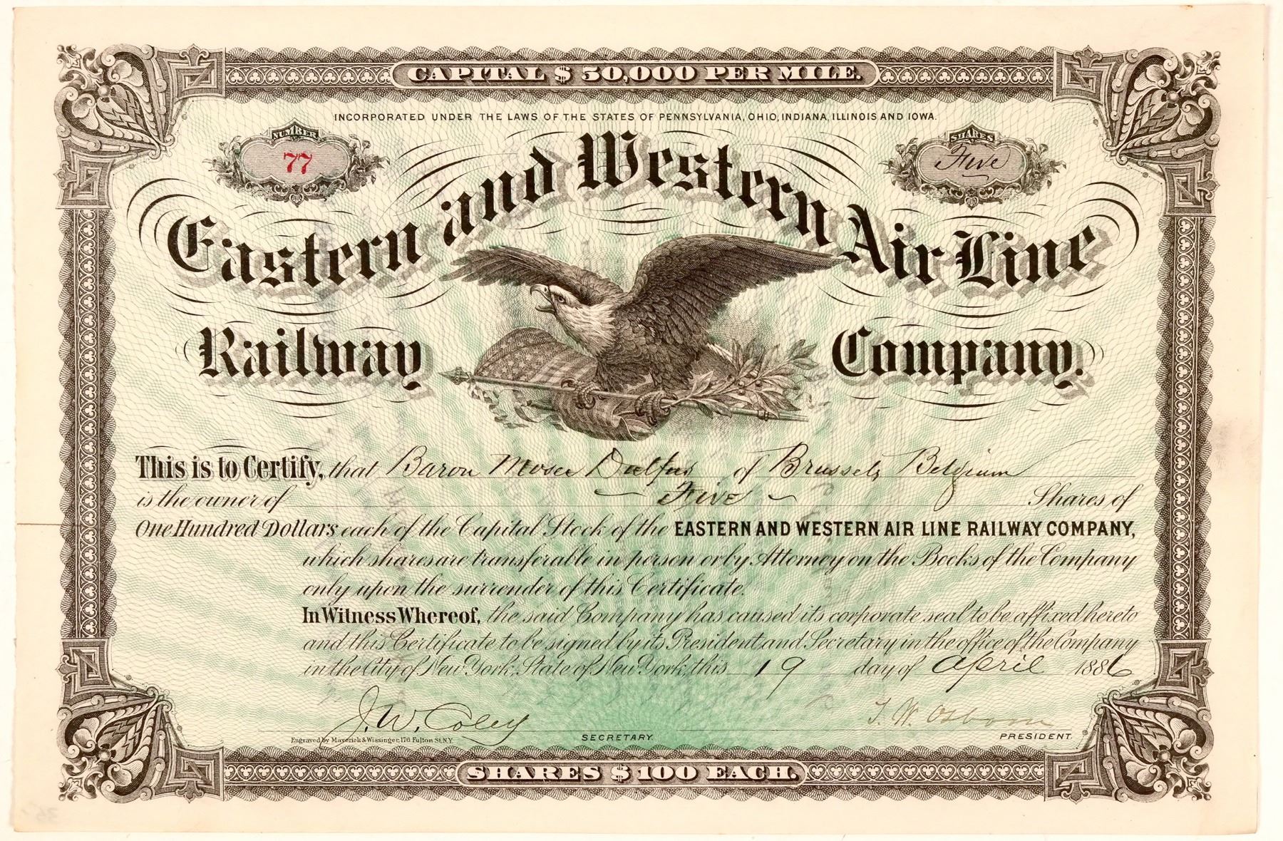 Inc. under the laws of Pennsylvania, Ohio, Indiana, Illinois and Iow. Cert. #77, issued for 5 shares. Shares were $100 each. Eagle with flag vignette. Black on creme with green tint. An air line railroad was a railroad that was relatively flat and straight, choosing a shorter route. Uncancelled.