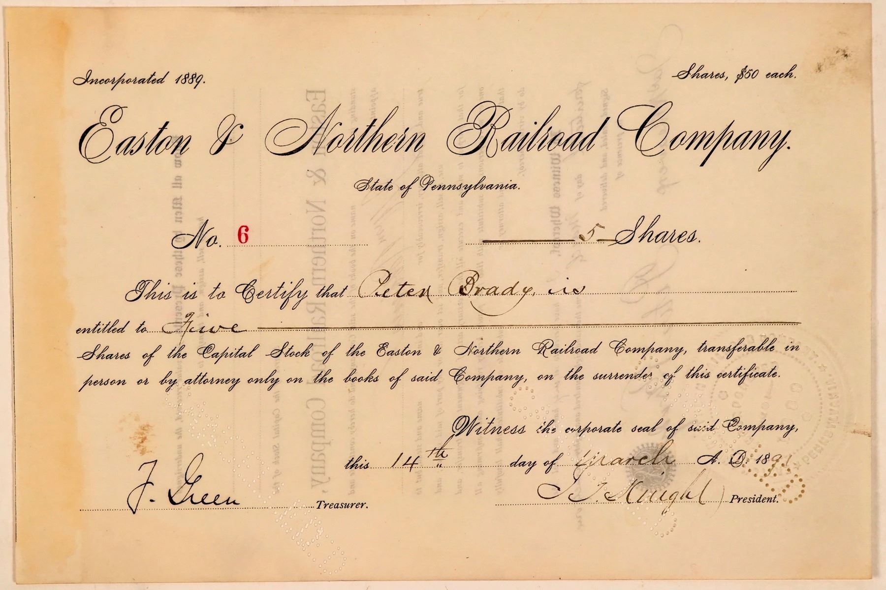 Low cert. #6, issued for 5 shares to Peter Brady and signed by T.J. Knight as president and F. Green as treasurer. Shares were $50 Each. Black on creme. The Easton and Northern was incorporated May 28, 1889, under the general laws of the State of Pennsylvania, for the purpose of constructing, operating, and maintaining a railroad between Easton and Belfast Junction, Pa. The line was to run 12.79 miles. The certificate has small hole punch cancels.