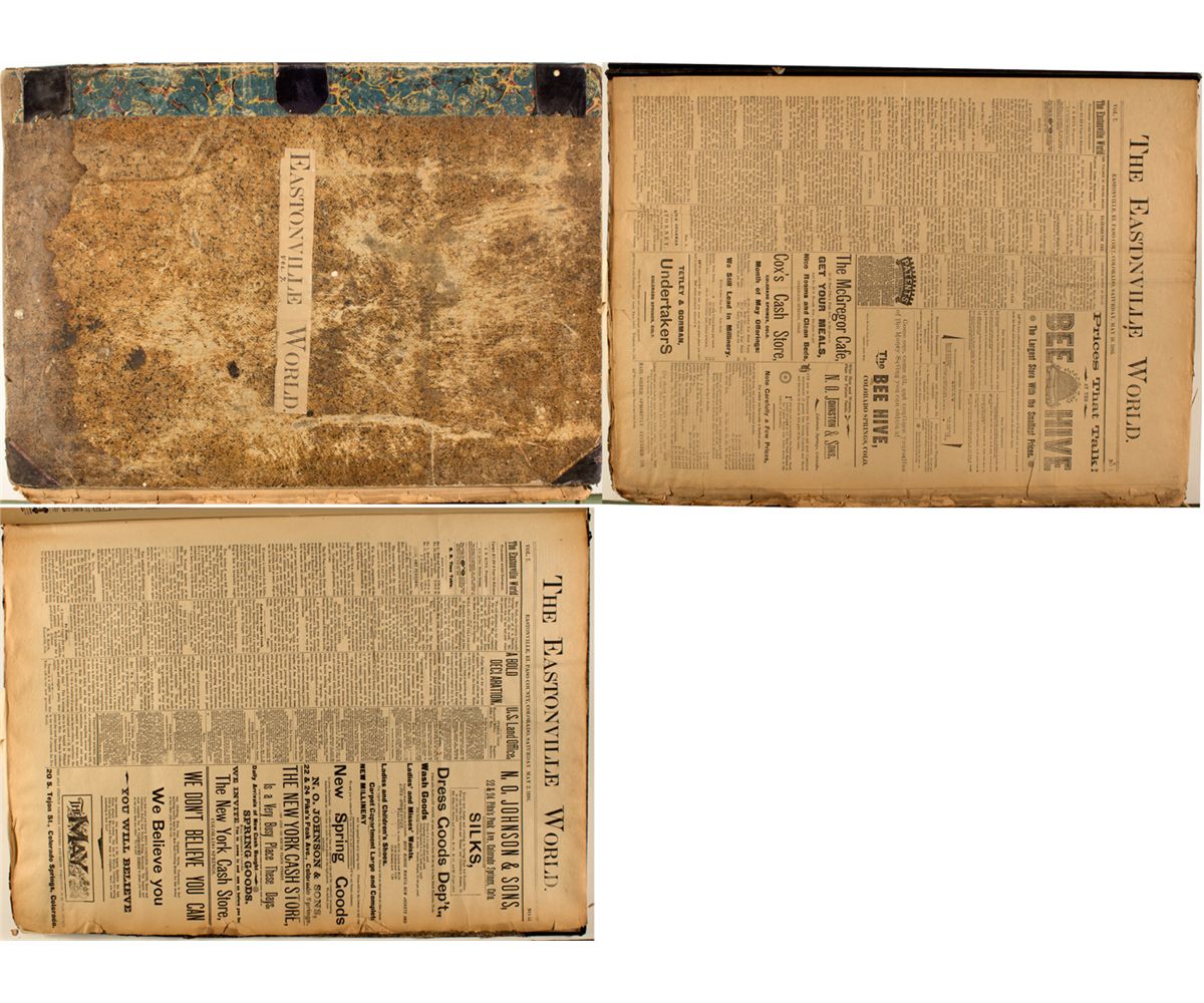 Includes Volume 7. No. 1, May 18, 1895 - No. 52, May 9, 1896. J.B King, publisher, measures 18 x 24 1/2". Eastonville began in 1872 as the town of Easton. There is a discrepancy in the date of the arrival of the post office to the town (1872-1880). Not a mining town, it was initially called the "Potato Capital of the World." Due to the arrival of the the Denver and New Orleans Railroad line, the town was moved 6 miles to the northeast in 1883. The name of the town was changed to Eastonville on May 27, 1884. The population grew to a high of about 300; which included 3 general stores, 3 churches, 3 hotels , a bakery, and a livery stable. The population had been dropping in the 1930's, and was accelerated after the Colorado and Southern Railroad tracks washed out. The area previously occupied by the town is now part of the urban area of Colorado Springs.