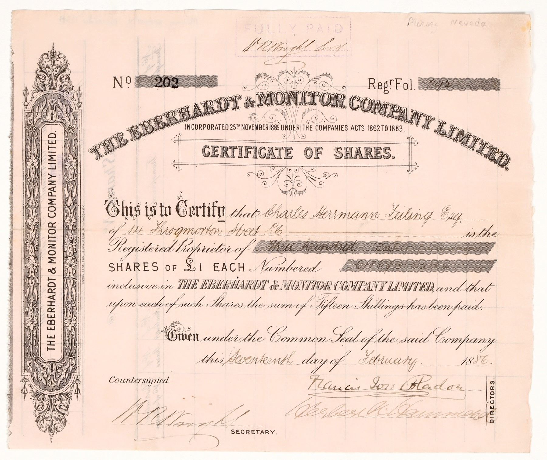 Rare. No. 202, issued for 300 shares to Charles Herrmann Tuling in 1886. Signed by two directors and the secretary. Not cancelled. Black print on pink paper. 8 x 9.5" According to a March 7, 1891 Eureka Sentinel article, William Read was superintendent and the company's mines were in the Taylor Mining District of White Pine County, Nevada. On August 21, 1886, The White Pine News reported the mine had shipped 4 bullion bars via Wells Fargo worth $3,000.