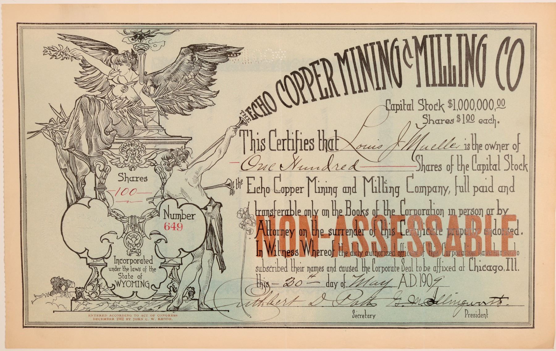 Inc. in Wyoming. No. 649, issued to Louis J. Muelle on May 20th, 1909 in Chicago. Signed by president Geo. Illingsworth and secretary Cuthbert D. Patt(?). Not cancelled. Spectacular design with black border and print, blue background and vignette of mythical figures with one blowing a horn that the company title is coming out of! Printed under the vignette is "Entered According to Act of Congress December 1902 by John C.W. Rhode." Folds, some toning. 7.75 x 12" Company office in Chicago. Mine office at Rudefeha, Carbon County, Wyoming. The company owned 4 claims, 80 acres, adjoining the Ferris-Haggarty Mine. Developed by a 114 ft. shaft, showing copper stains. [Mines Register, 1906, pg. 466] City: Carbon County, Rudefeha State: Wyoming Date: 1909