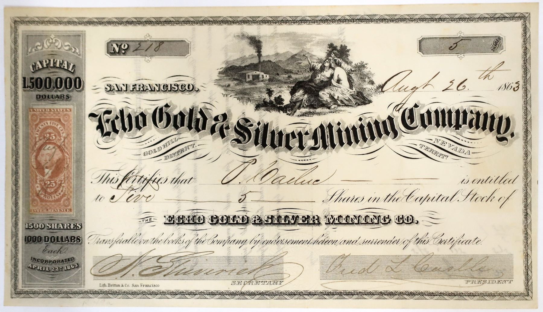 Gold Hill District, Nevada Territory (printed under title). Incorporated April 22, 1863. # 218, issued for five shares to P. Caduc on Aug. 26th, 1863 in San Francisco. Signed by president Fred. L. Castle and secretary N. Shiverick. Not cancelled. Black border and print, vignette of women sitting on hill with a mine in the distance. Lith. Britton & Co., San Francisco. 25 cent US revenue adhesive stamp attached on the left border. Folds, creases, light toning. The Echo mine was actually in the Devil's Gate district. One of the mines Mark Twain (Samuel L. Clemens) invested in. It was still active as late as 1878, but there seemed to be no real production. Secretary Shiverick was in the Comstock area when it was still part of the Utah Territory. He had a mercantile store in Carson City. Notes on the company and copy of Daily Alta California showing Samuel Clemens (Mark Twain) was an investor. Also a biography of Shiverick