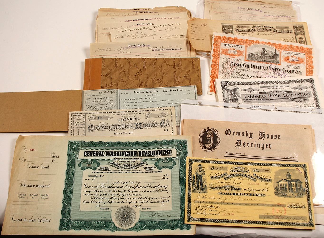 Nice group for the Nevada collector or dealer. About 30 Storey County bond coupons; about 65 Reno Bank credit receipts showing who warrants or checks were issued to (1905-6); Ormsby House Derringer, vol1, No.3, 1989; three State warrants with the miner at left, 1880's; Fairmont Consol stock, u/i; Original Hidden Treasure stock, 1860's, u/i; 6 misc stocks; 2 books of Minden Fund receipts 19xx, u/i; map of a portion of the Goldfield mining district. Date: Location: Nevada HWAC# 56018