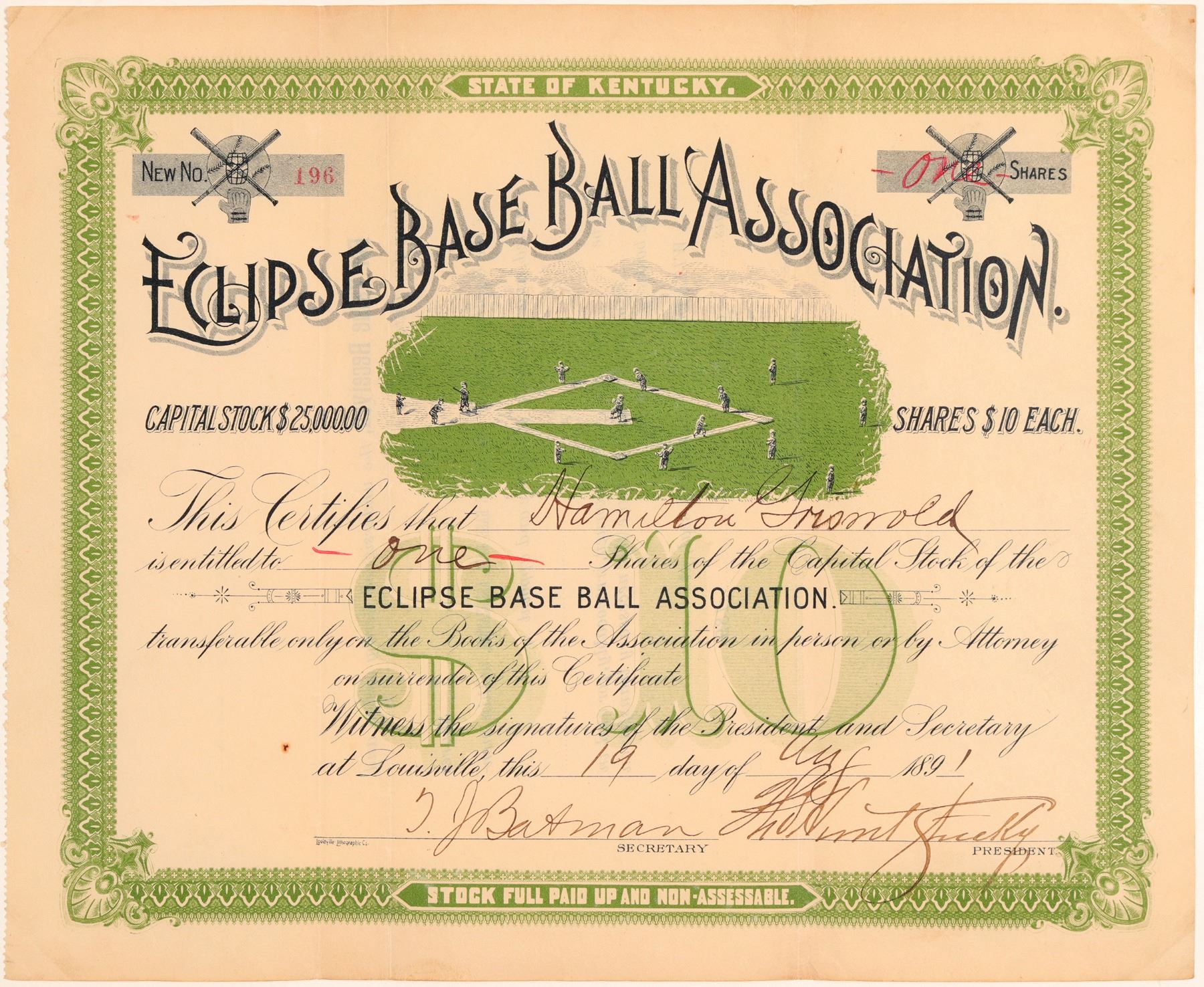 Vignette of a baseball game in progress! # 496 for 1 share to Hamilton Griswold. Signed by Batman and president Stickley. Not cancelled. Crossed bats by cert number and number of shares. (Is this an early reference to the famed Louisville Slugger?) Green on white with green underprint '$10.' The Louisville newspapers show the first game by this club as as early as 1858! In 1881 they returned to Louisville on November 1st as champions of the south! They has travelled to St. Louis (Red and Brown Stockings), Memphis (Reds) and New Orleans (Lone Stars). Ken Prag Collection