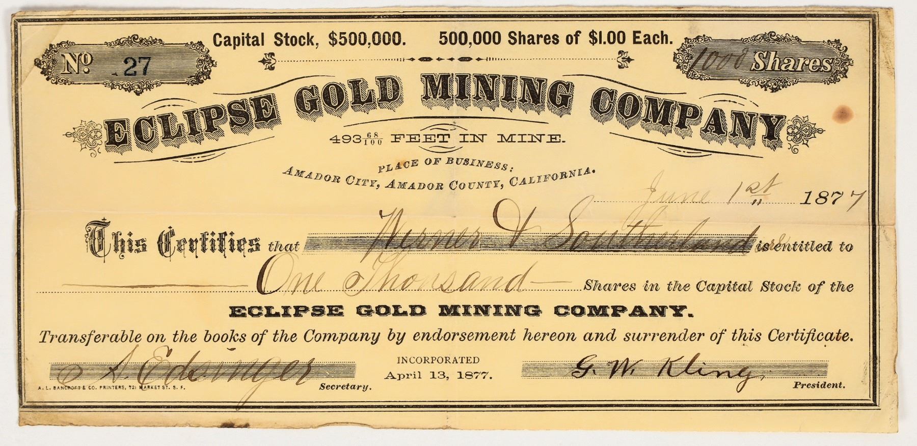 Very rare. "Place of Business, Amador City, Amador County, California" printed under title. Inc. April 1877. No. 27, issued for 1,000 shares to Werner Southerland in June 1877. Signed by president GW King and secretary A. Edsinger. Not cancelled. Black print on yellow paper. 4 x 8.5" Folds, creases, some discoloration.