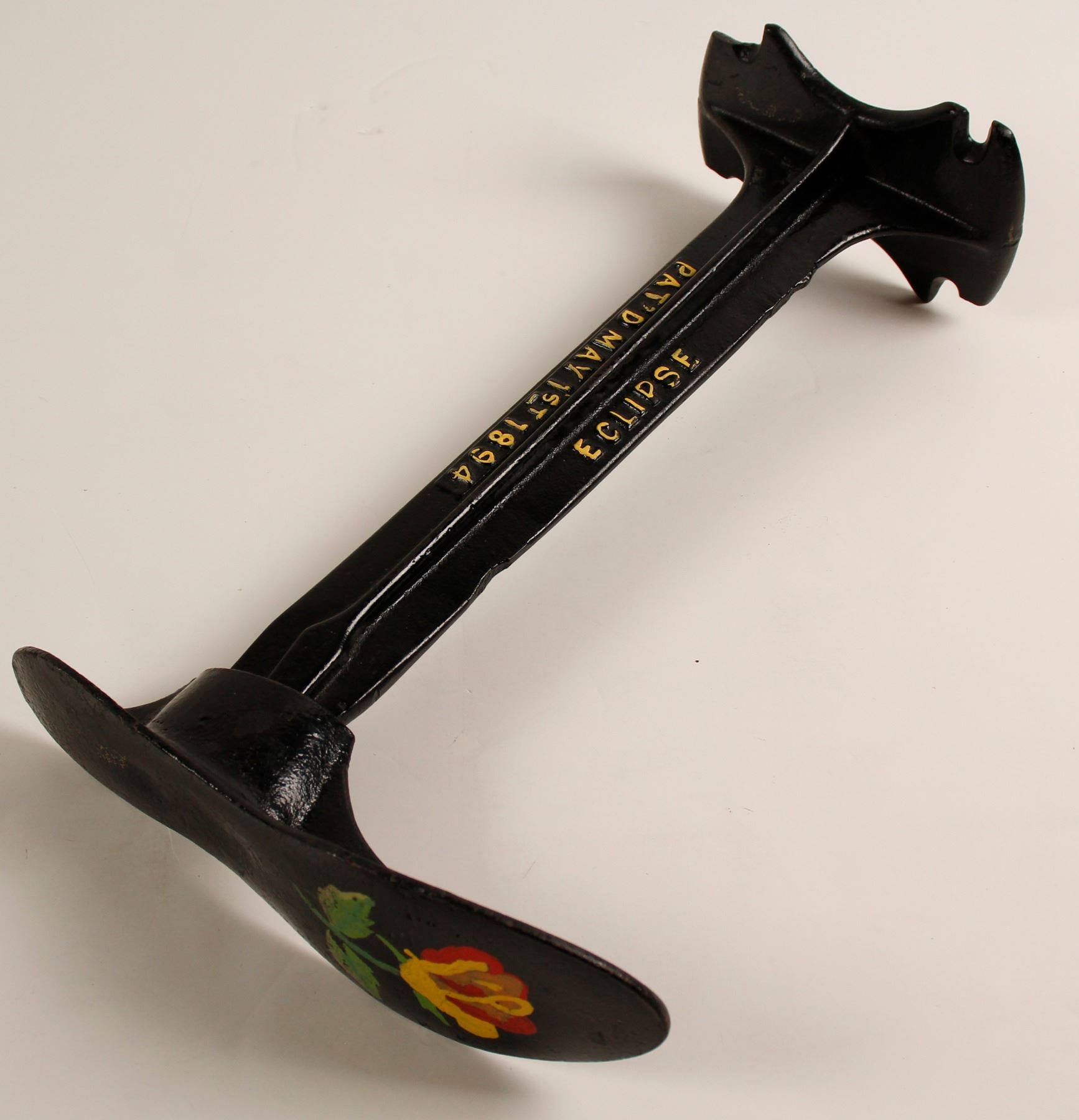Cast iron Eclipse anvil. Pat'd May 1st, 1894 in raised yellow letters. Painted black with flower on sole.