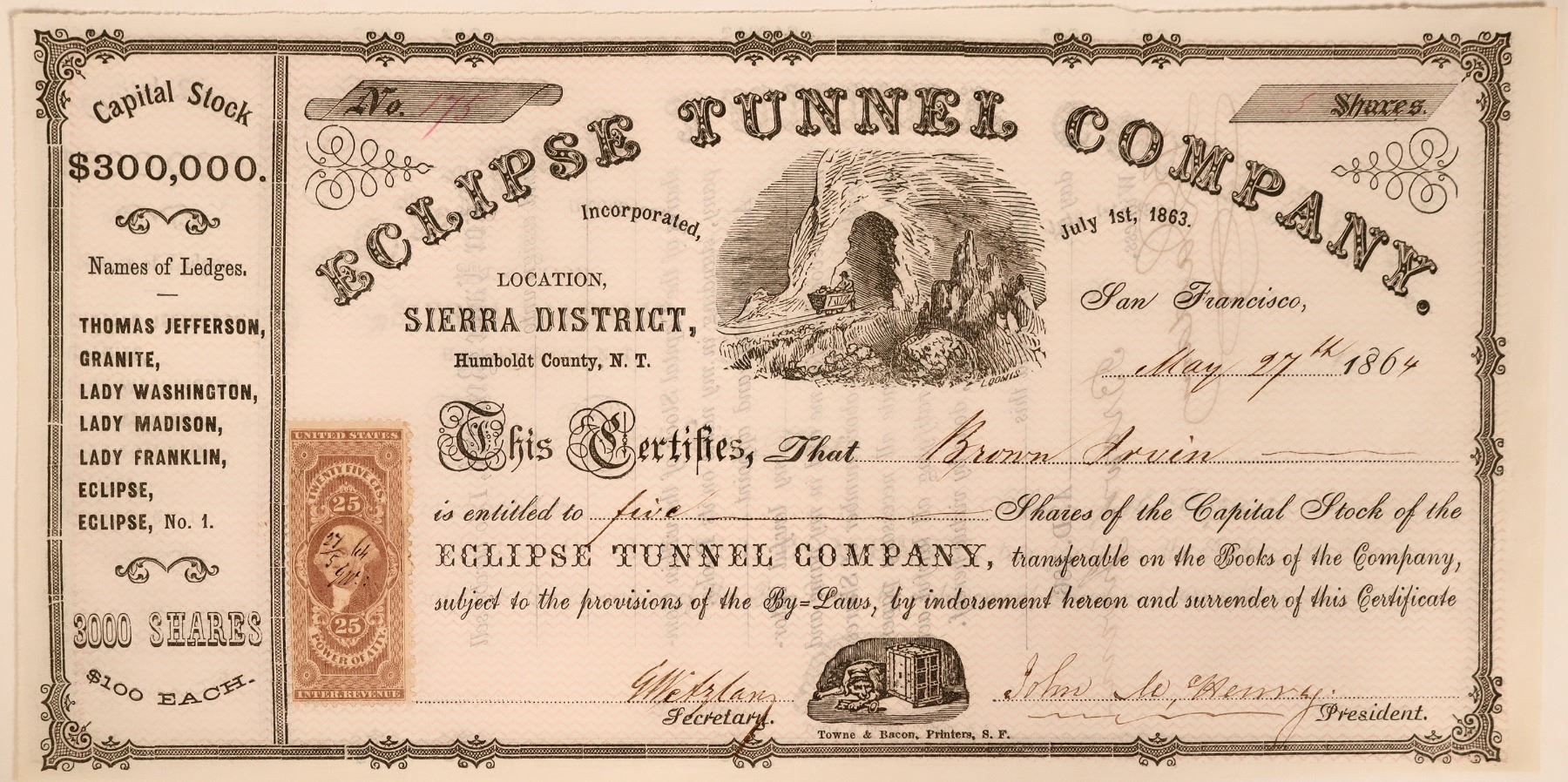 Territorial Nevada stock issued in San Francisco on May 27th, 1864. Location printed on certificate: Sierra District, Humboldt County, Nevada Territory. Ledges listed on the side: Thomas Jefferson, Granite, Lady Washington, Lady Madison, Lady Franklin, Eclipse, and Eclipse No. 175. Incorporated in 1863. Cert. #186, issued to Brown Irvin for 5 shares. Signed by John M. Henry, president, and by Wetzlan as secretary. Vignette of ore cart being pushed out of the mouth of a tunnel. Black border on light pink safety printed paper, with black print. Uncancelled. Printer: Towne & Bacon, S.F. Applied 25ct revenue stamp at left. 5.5 x 10.5.” Very fine. There is an Irvin Brown listed as a real estate and money agent in Langley’s 1864 directory. There are several listings for John M. Henry. This one was possibly a street contractor, according to the same reference. The Sierra District was organized in 1863 across the Buena Vista Valley to the east of Star Peak at the north end of the East Humboldt Range, 10 miles northeast of Mill City. Dun Glen (later named Chafey—or Chaffey—for the mine there) was the business center for the district. The district has been a continuous producer and fairly profitable.