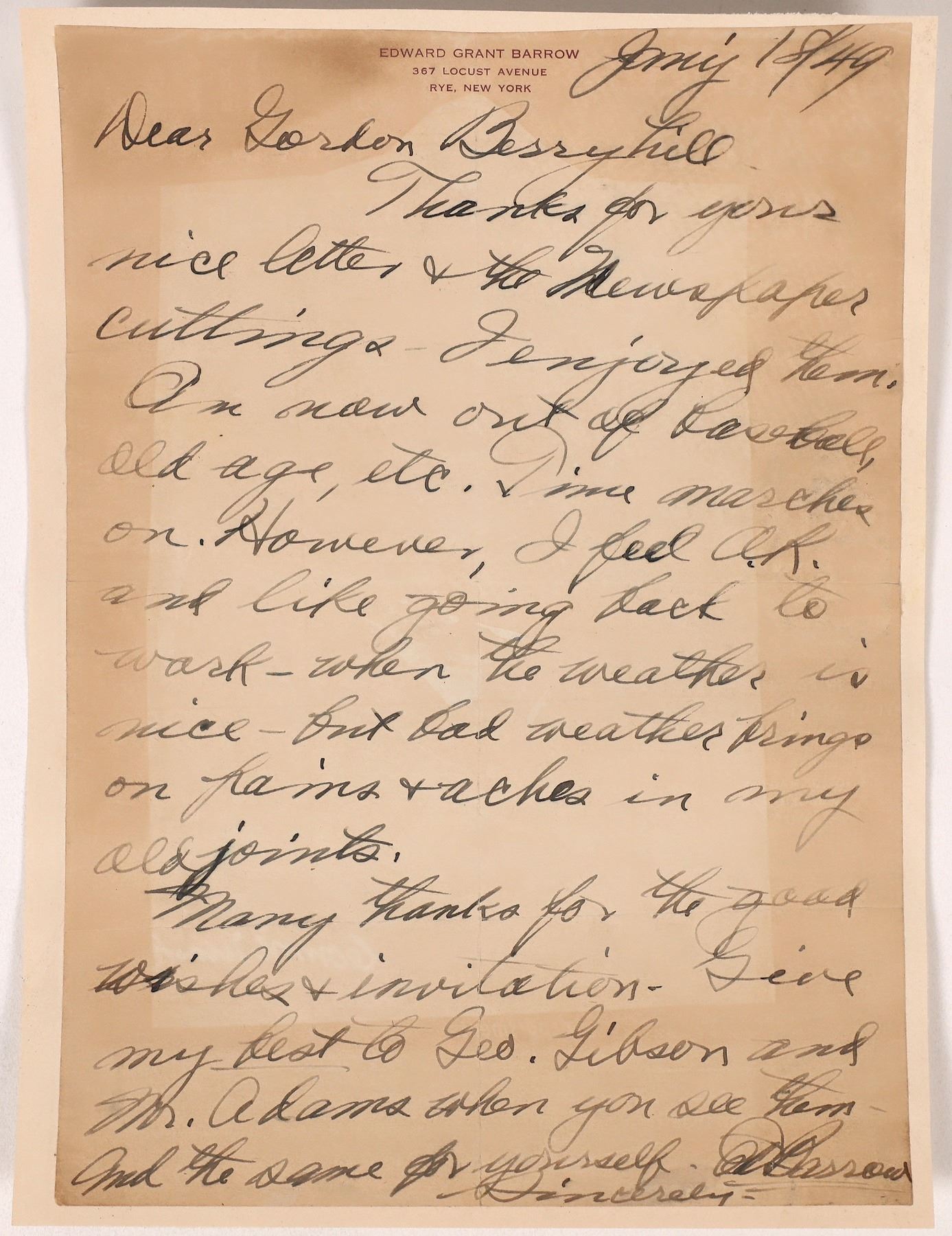 Handwritten letter on personal letterhead for Edward Grant Burrows, January 18th, 1949. Message to Gordon Berryhill, thanking him for letter. "Am now out of baseball, old age, etc... bad weather brings on pains & aches in my old joints..." Signed by Burrow. Attached to album page. Burrow was business manager (1921-39) and then team president (1939-45) of the New York Yankees and is credited with building the Yankee dynasty. He was also the field manager of the Detroit Tigers and Boston Red Sox.