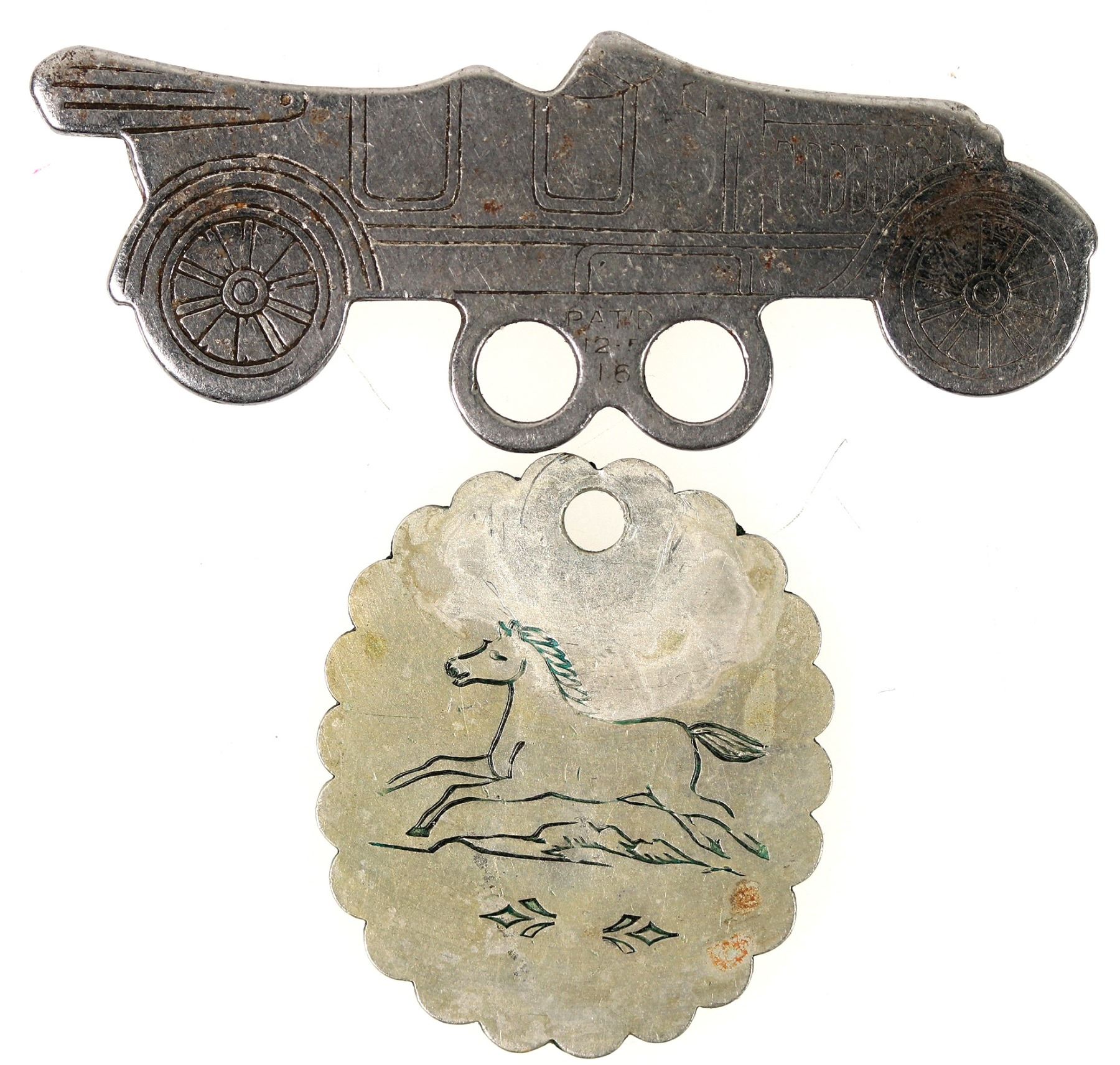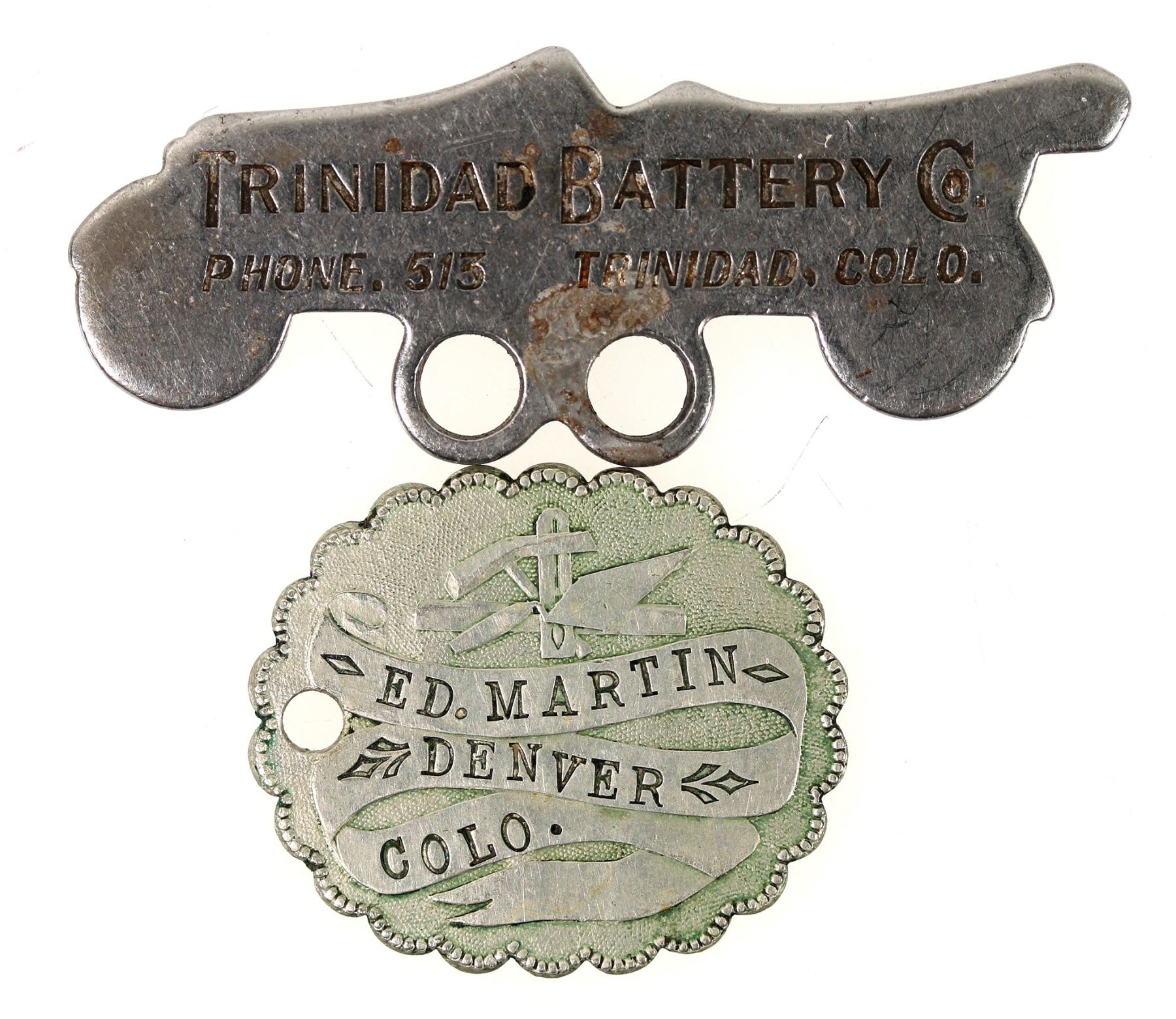 Two Colorado medals: 1) Ed Martin / Denver / Colorado // engraved galloping horse on reverse; holed, 30 x 25 mm. 2) Trinidad Battery Co. / Phone 513 / Trinidad, Colorado 55 x 18 mm.