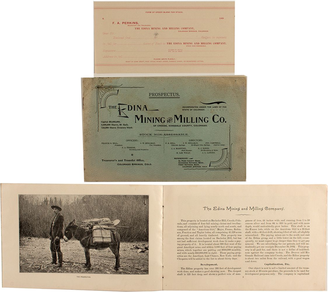 Prospectus. 12 pp. Five photos and a map showing all the principal mines on Bachelor Hill with the "Edina" group being the most prominent. Inserted is a blank form for ordering stock dated 189_. The prospectus describes the existing workings and outlines future development. Great early photos of Creede, including the town 3 weeks after the first building was erected. Condition: fading to green cover and some soiling. Pages are clean. Silver was discovered in Creede in 1890. Production at Creede mines was nearly continuous from 1890-1985. The Edina Mining and Milling Co. had one of the first claims on Bachelor Hill. Measures 9 1/4" x 6"City: CreedeCounty: HinsdaleState: CODate: