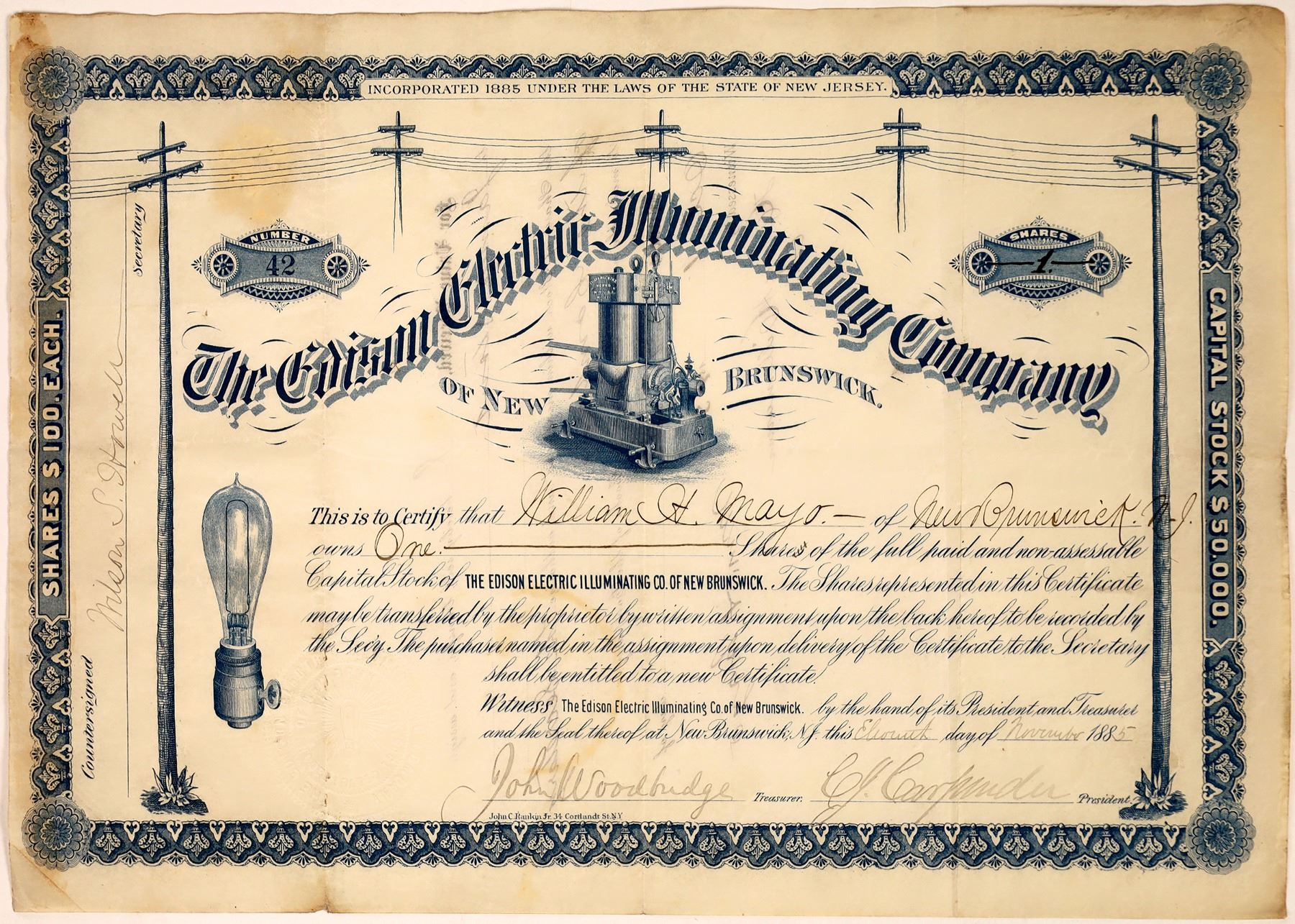 Issued by The Edison Electric Illuminating Company on December 11. 1885 to William H. Mayo. It is for one share at $100 per share. Cert is signed by treasurer John Woodbridge and president C.J Carpenter. There is a vignette of a generator and an Edison lightbulb. It has been cancelled. There is crease folding and some slight staining. Please see photos for more detail and condition.