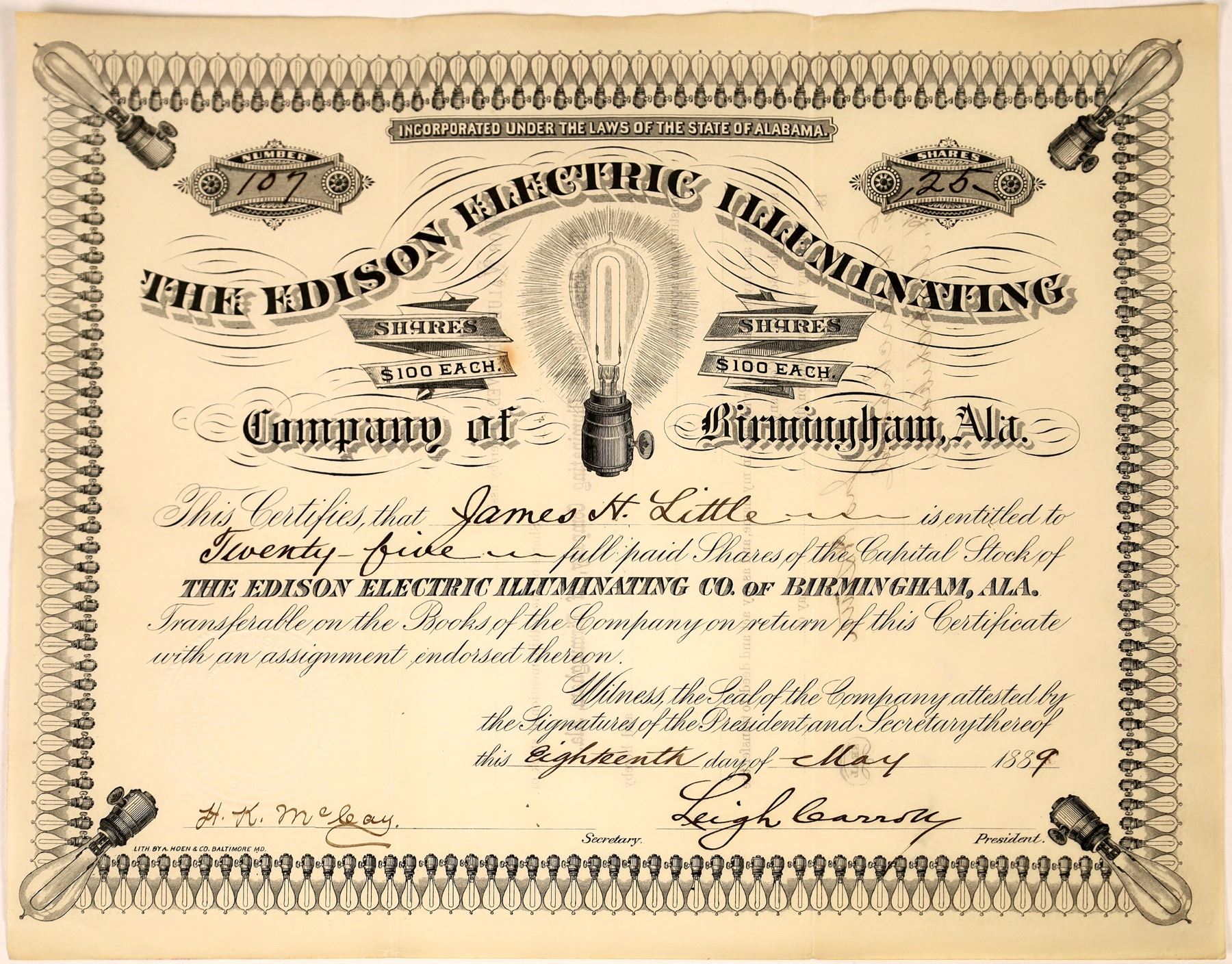 Stock certificate issued by The Edison Electric Illuminating, It is issued to James Little for 25 shares at $100 per share. It is signed by treasurer H.K. McCay nd presidentLeigh Connolly. There is a lightbulb and socket vignette and is dated May 18, 1889. Some fold creasing. Please see photo for more detail and condition.