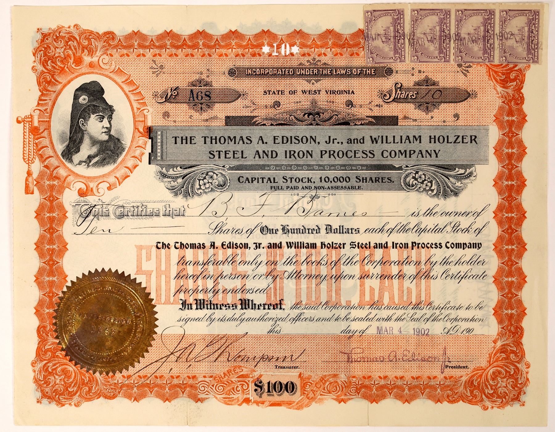 Stock #A68 issued to B.F. Barnes for 10 shares at $100 per by The Thomas Edison Jr. and William Holzer Steel and Iron Process Company. It's signed by treasurer J. Thompson and Thomas A. Edison Jr. president. There are four purple revenue stamps featuring a steamship picture. There is also a Greek themed vignette