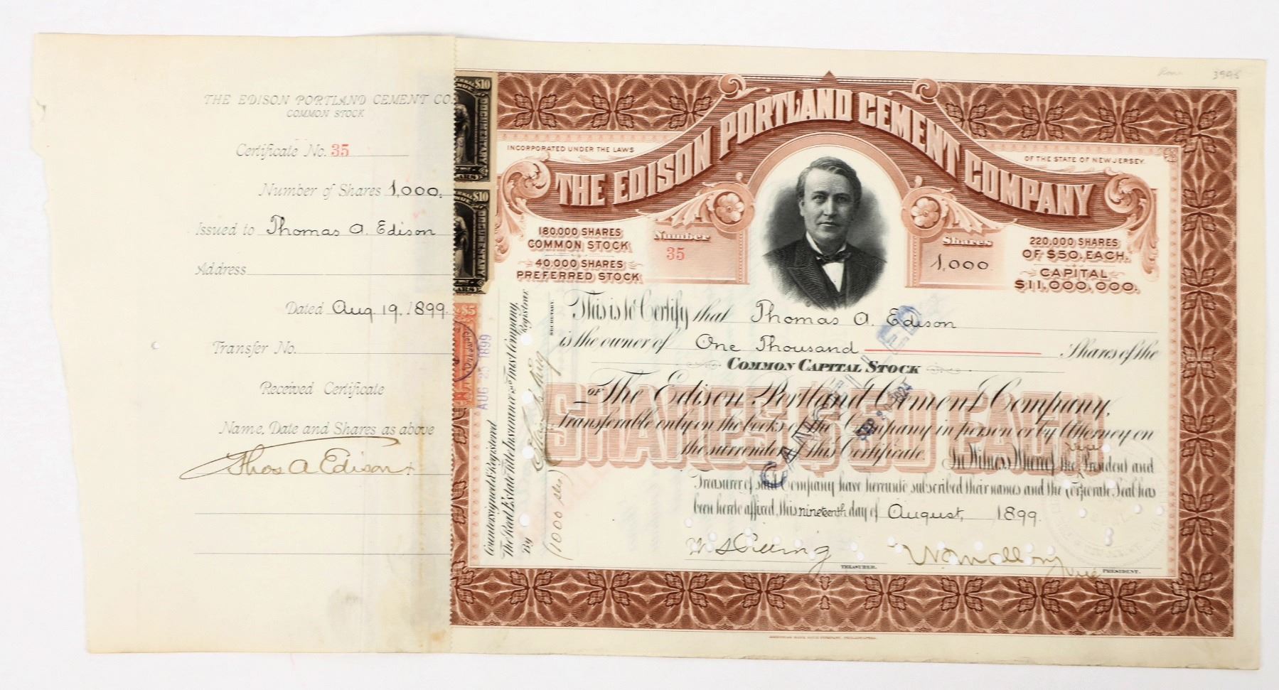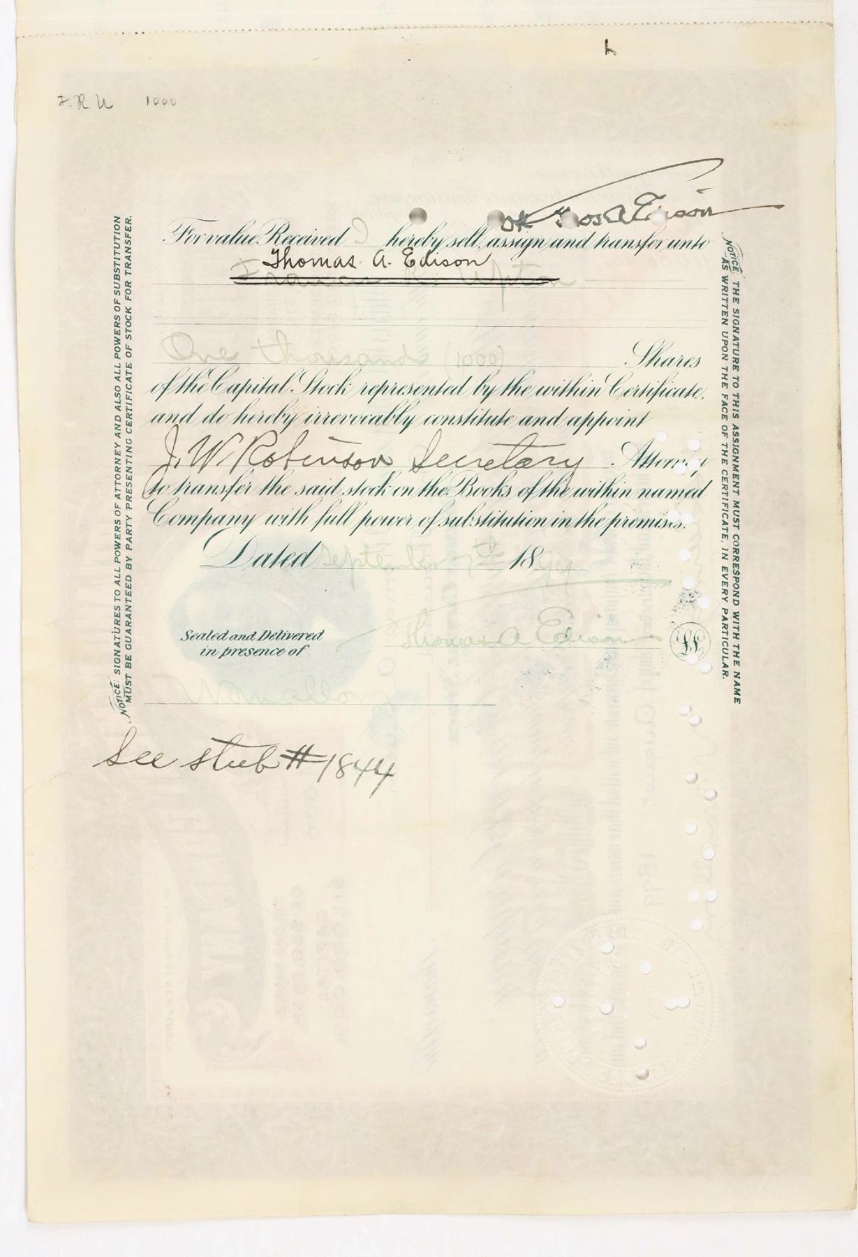 Fantastic! No. 35, issued to Thomas Edison in 1899 for 1,000 shares. Signed by Edison on the stub, still attached, as well as twice on the reverse of the stock! (One of those signatures has very faded ink). Punch cancelled, which affects one of the signatures. Thomas Edison (1847–1931) was an American inventor, entrepreneur, and one of history's most prolific innovators, holding over 1,000 patents. He developed groundbreaking technologies including the phonograph, the incandescent light bulb, and the motion picture camera. Edison's creation of the first industrial research laboratory in Menlo Park, New Jersey, revolutionized the process of invention by fostering teamwork and systematic experimentation. His work in electrical power led to the founding of the Edison Electric Light Company, which later became part of General Electric. Known as the "Wizard of Menlo Park," Edison's inventions transformed modern life and helped usher in the age of electricity and mass communication.