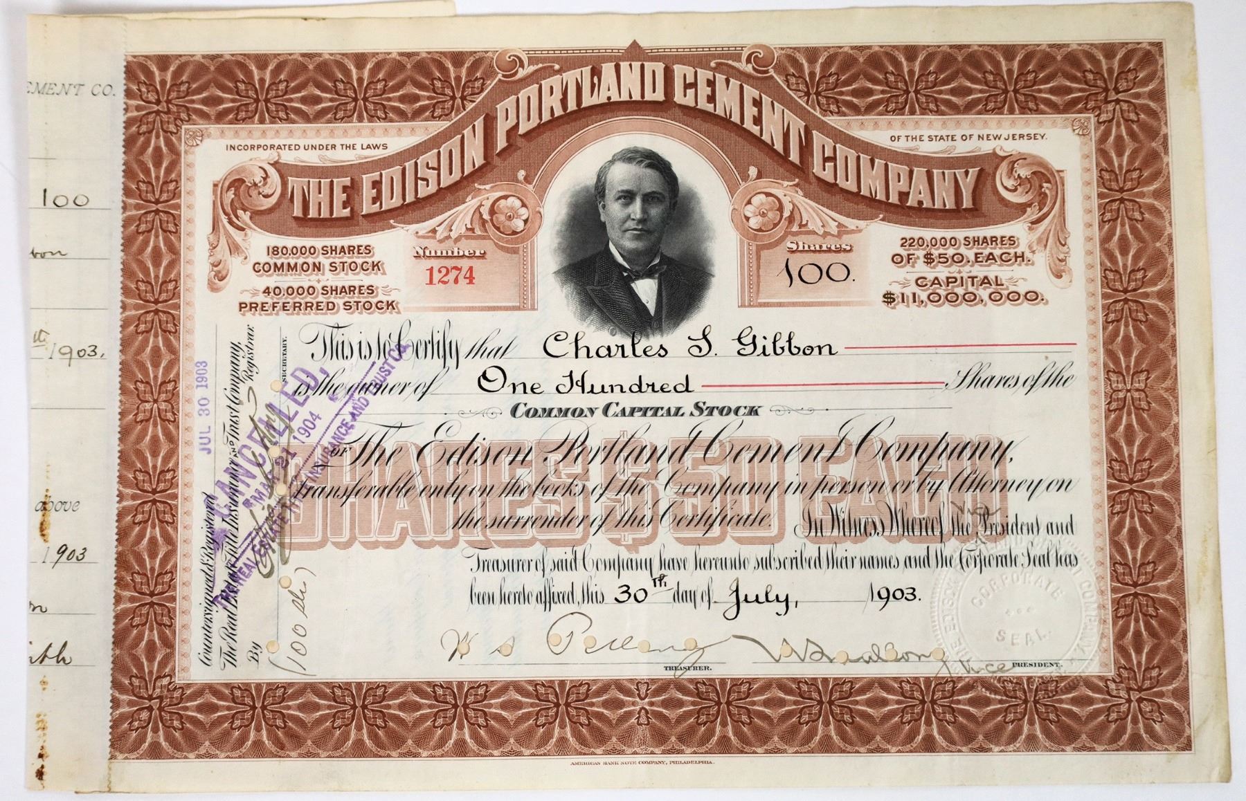 Issued in 1903. Nice vignette of Thomas Edison. Issued for 100 shares and canceled. Stub attached at the left. The Edison Portland Cement Company was a venture by Thomas Edison that helped to improve the Portland cement industry. Edison was developing an iron ore milling process and discovered a market in the sale of waste sand to cement manufacturers. He decided to set up his own cement company, founding it in New Village, New Jersey in 1899, and went on to supply the concrete for the construction of Yankee Stadium in 1922. Hole and stamp canceled. Very good condition. 1903