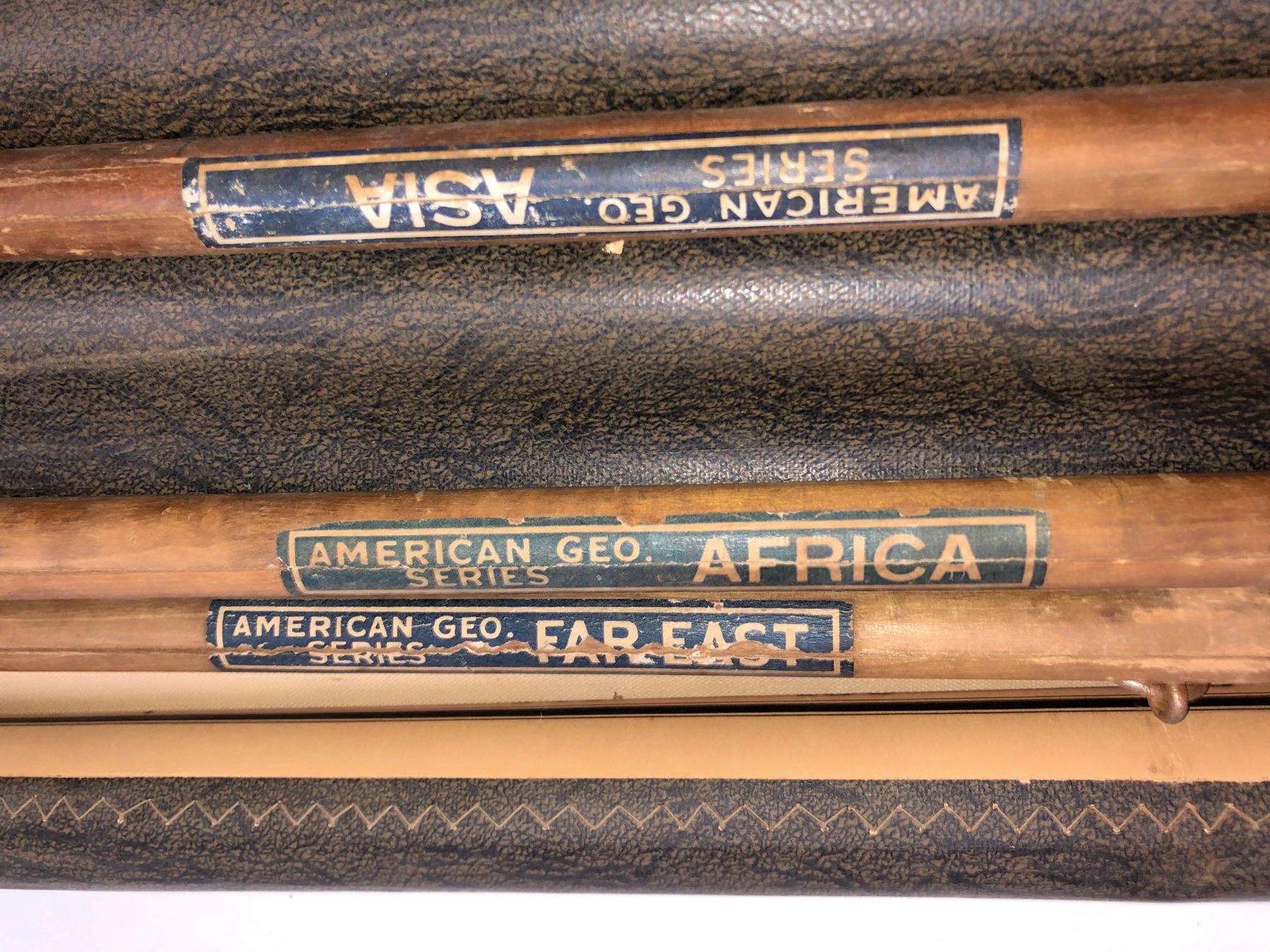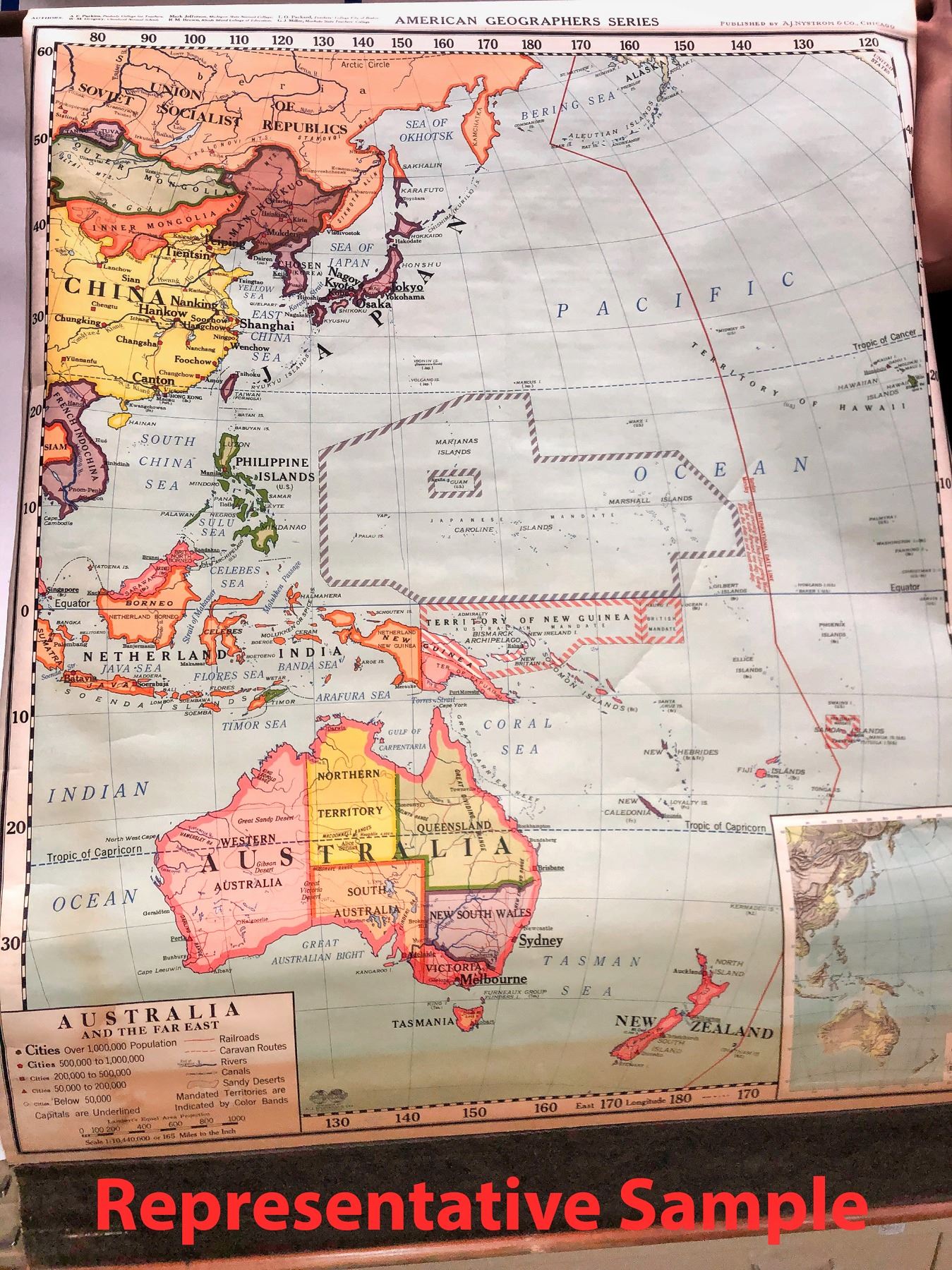 (3) Classic wall maps with wood dowels. From the American Geographic series, by A.J. Nystrom, Chicago 1939. Includes Africa, 43" wide, Australia and the Far East, 43" wide, and Asia, 51" wide. Generally very fine to excellent condition.