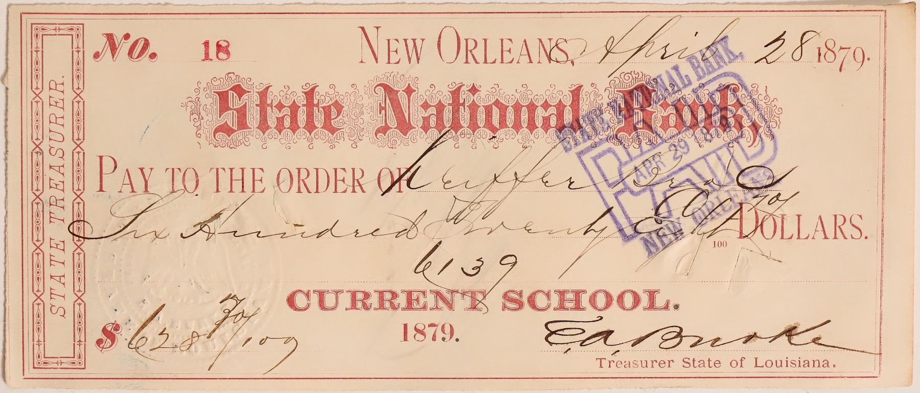 1879 Edward A Burke signed check. "Edward Austin Burke or Burk (September 13, 1839 -September 24, 1928), was the Democratic State Treasurer of Louisiana following Reconstruction. Burke later fled to Honduras after it was discovered that there were misappropriations of state treasury funds. While in Honduras Burke became a major land owner and held government positions within Honduras' nationalized railway systems. He remained an exile until his death nearly four decades later." from Wikipedia